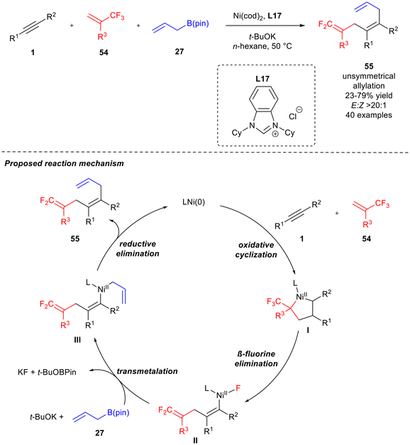 An innovative technique for the unsymmetrical bis-allylation of alkynes, crucial for constructing complex molecular architectures in organic synthesis, was recently introduced by Ji and co-workers (Scheme 22).32 The authors utilised a nickel catalyst, specifically a robust Ni(0)/NHC (N-heterocyclic carbene) system, to facilitate this reaction under mild conditions. This method allowed for the effective use of both electrophilic trifluoromethyl alkenes 54 and nucleophilic allylboronates 27, resulting in the formation of valuable skipped triene 55 products with high regio- and stereoselectivity. The optimised reaction conditions consisted of alkyne 1, α-trifluoromethyl alkene 54, and allylboronates 27 reacted with 5 mol% Ni(cod)2, 5 mol% NHC ligand L17, and 1.5 equivalents of t-BuOK in n-hexane at 50 °C for 24 hours. The authors addressed challenges in unsymmetrical bis-allylation, which has been underexplored compared with symmetrical methods. They emphasised the importance of the selectivity due to potential complications from multiple reactive species. The mechanism (Scheme 22) begins with the oxidative cyclometallation of an alkyne 1 and α-trifluoromethyl styrene 54, creating a crucial nickel metallacycle intermediate I. This intermediate enables the selective syn-addition of the alkyne to the electrophile, ensuring desired regioselectivity. Following this, a β-fluorine elimination step occurs, releasing a fluorine atom from the trifluoromethyl group and generating a new σ-complex II which undergoes transmetalation with allylboronate 27, introducing the allyl group into the intermediate III and affording the skipped triene 55 by reductive elimination. The authors noted that the regioselectivity remained consistent despite potential competitive pathways due to the steric hindrance of the tertiary C–Ni bond, which makes certain interactions less favourable. Furthermore, the method demonstrated a wide functional group tolerance, making it versatile for various synthetic applications.32