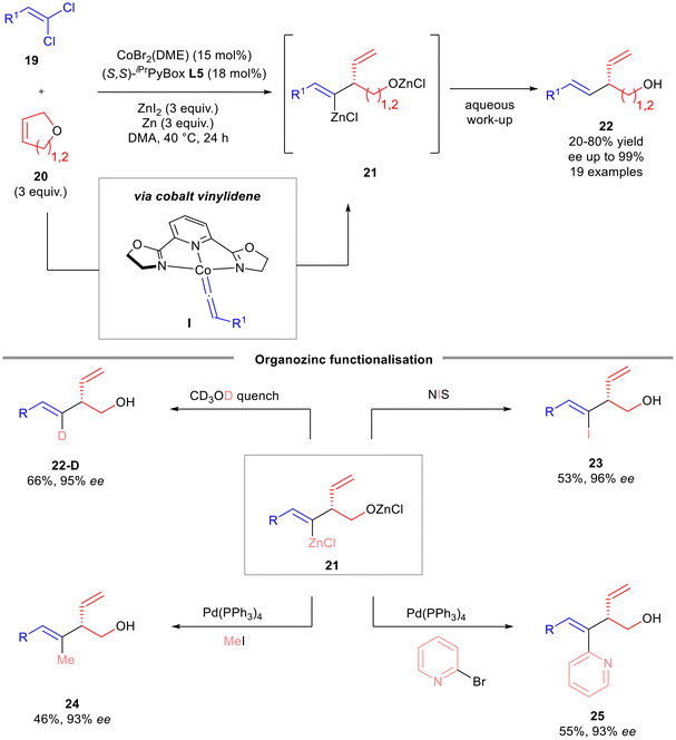 Recently, Uyeda disclosed an asymmetric cobalt-catalysed procedure to access highly functionalised skipped dienes in an enantioselective manner through the aid of a chiral ligand L5 in the presence of a Zn/ZnI2 system.10 This versatile protocol afforded acyclic organozinc compounds 21, which could be further functionalised with an electrophile, starting from vinylidenes 19 and 2,5-dihydrofuranes 20 (Scheme 6). Deep mechanistic investigations, supported by DFT calculations, suggested a Zn-mediated generation of the cobalt vinylidene species I that could undergo a [2 + 2] cycloaddition pathway, followed by a ring-opening step involving a challenging ZnI2-assisted outer-sphere β-O elimination to afford 21. The scope of the methodology was mostly explored on the substrates 19. In fact, 1,1-dichloroalkenes bearing electron-donating and electron-withdrawing aryl groups furnished skipped dienes 22 in moderate to good yields with excellent enantioselectivities. Furthermore, heterocycles including quinoline and benzofuran, as well as different functional groups potentially critical for transition metal-catalysed procedures, such as boronate esters and bromides, were well tolerated. The ring-opening reaction produced organozinc compounds 21 that, after aqueous work-up, were quenched to alcohols containing the skipped diene motif 22. Nonetheless, 21 could instead be trapped with different electrophiles, accessing a broader range of functionalised 1,4-dienes. Indeed, deuterated product 22-D was obtained with 82% deuteration by quenching the crude reaction with CD3OD. Otherwise, functionalisation with NIS (N-iodosuccinimide) furnished the iodinated C2 skipped diene 23 with 53% yield and excellent enantioselectivity. Finally, Negishi reaction conditions could be employed to obtain the cross-coupling products with methyl iodide and 2-bromopyridine (products 24 and 25, 46% and 55% yield, respectively).