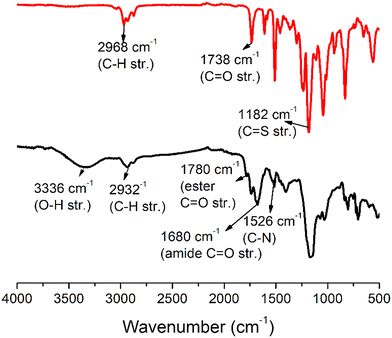 | | Fig. 4 Comparison of the FTIR spectrum of M2 (black line, top) and ARM-PTU-G1-OH (red line, bottom). | |