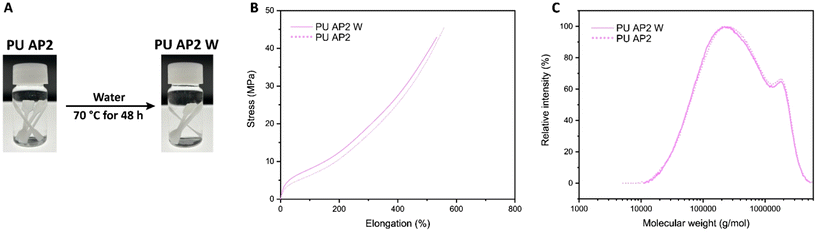 | Fig. 5 (A) Photographs of PU AP2 before and after water exposure, (B) Stress–strain curves, and (C) GPC traces of the specimens. | ||