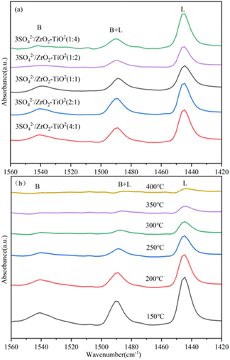 Fig. 6 Py-FTIR spectra of SO42−/ZrO2–TiO2 catalyst, (a) desorption spectra of different catalysts at 200 °C, (b) desorption spectra of SO42−/ZrO2–TiO2 (4[thin space (1/6-em)]:[thin space (1/6-em)]1) catalyst at different temperatures.