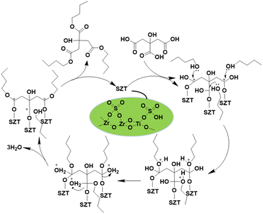 The esterification of CA with n-butanol can be explained by the interaction between the adsorbed CA and free n-butanol, which adheres to the Eley–Rideal (E–R) model, as outlined in ref. 32–35. Scheme 2 present the E–R mechanism for the esterification process under the influence of the 3SO42−/ZrO2–TiO2 (4[thin space (1/6-em)]:[thin space (1/6-em)]1) catalyst based on the proposed model.36,37 Typically, the CA carboxyl group is first adsorbed and activated by a catalyst, leading to the formation of a carbonyl ion and its subsequent reaction with a hydroxyl group. This step is followed by hydrogen transfer and dehydration, resulting in the formation of an intermediate that ultimately yields the TBC via a desorption process. Notably, the mass transfer resistance of large molecular substances, such as CA and its ester, can affect the efficiency of the catalyst, as indicated in ref. 38. Thus, the catalyst performance is influenced not only by the number of active sites but also by its textural properties.