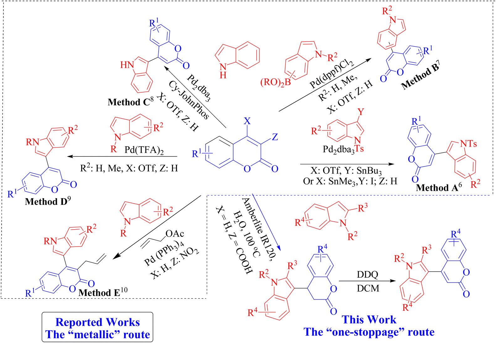|  | Scheme 1  Schematic of reported Pd-catalysed protocols and the present two-step protocol for the synthesis of 4-indolyl coumarin derivatives. |  |