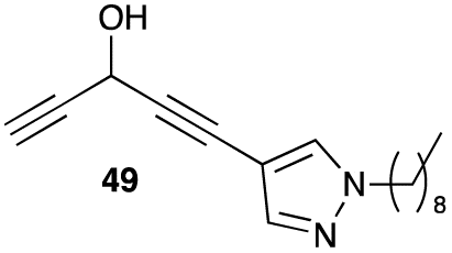 1-(1-Nonyl-1H-pyrazol-4-yl)penta-1,4-diyn-3-ol (49). Compound 44 was dissolved in THF (1.5 mL). Under N2 atmosphere, TBAF (1 M in THF, 573 μL, 0.573 mmol, 1.3 equiv.) was added dropwise at −20 °C. The mixture was warmed to 10 °C over 2.5 h. After completion of the reaction, a saturated aqueous solution of NH4Cl was added to quench the reaction. The resulting mixture was extracted with diethyl ether. Combined organic layers were washed with brine, dried over MgSO4, filtered and concentrated under reduced pressure. The residue was purified by flash chromatography on silica gel using a gradient of up to 40% of diethyl ether in pentane. The dialkynylcarbinol 49 (51 mg, 42%) was isolated as a yellow oil. 1H NMR (300 MHz, CDCl3) δ (ppm) 7.61 (d, J = 0.7 Hz, 1H), 7.52 (d, J = 0.7 Hz, 1H), 5.34 (dd, J = 6.4, 2.3 Hz, 1H), 4.10 (t, J = 7.1 Hz, 2H), 3.74 (d, J = 6.4 Hz, 1H), 2.59 (d, J = 2.3 Hz, 1H), 1.83 (quint, J = 7.4 Hz, 2H), 1.37–1.16 (m, 12H), 0.96–0.85 (m, 3H). 13C NMR (75 MHz, CDCl3): δ (ppm) 142.0, 132.3, 101.5, 86.7, 81.2, 76.3, 72.5, 52.6, 52.4, 31.8, 30.1, 29.4, 29.2, 29.1, 26.5, 22.6, 14.1. HRMS (DCI-CH4): calcd for C17H25N2O [MH]+: 273.1967 m/z, found: 273.1970 m/z.
