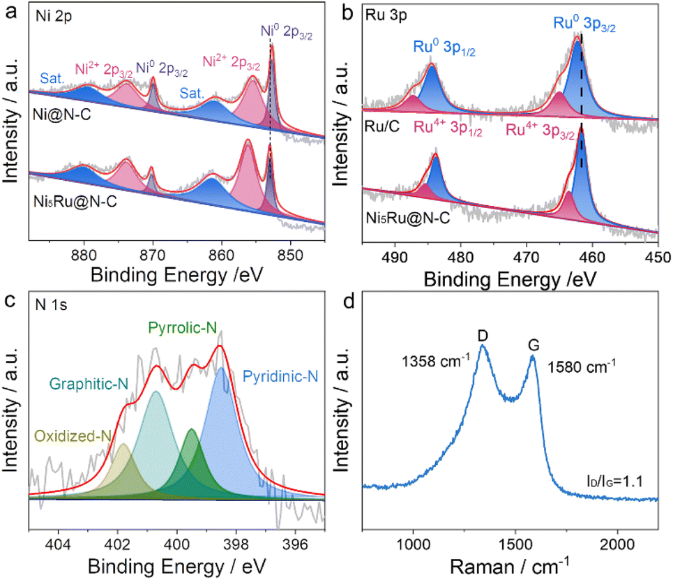 | Fig. 3 (a) Ni 2p XPS spectra of Ni5Ru@N-C and Ni@N-C; (b) Ru 3p XPS spectra Ni5Ru@N-C and commercial Ru/C; (c) N 1s XPS spectra and (d) Raman spectrum of Ni5Ru@N-C. | ||