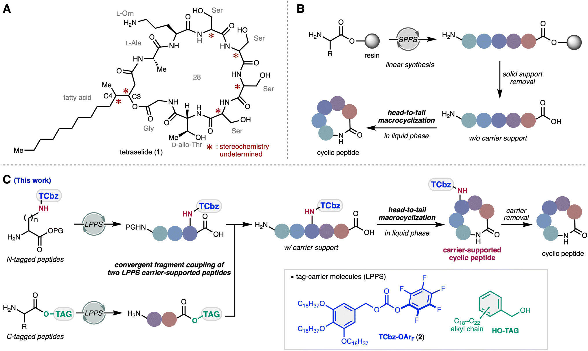 | Fig. 1 Natural product tetraselide and peptide synthesis strategy. (A) The structure of tetraselide. (B) Typical SPPS strategy for cyclic peptides. (C) Our convergent strategy to synthesize macrocyclic peptides. SPPS: solid-phase peptide synthesis. LPPS: liquid-phase peptide synthesis. PG: protecting group. | |
