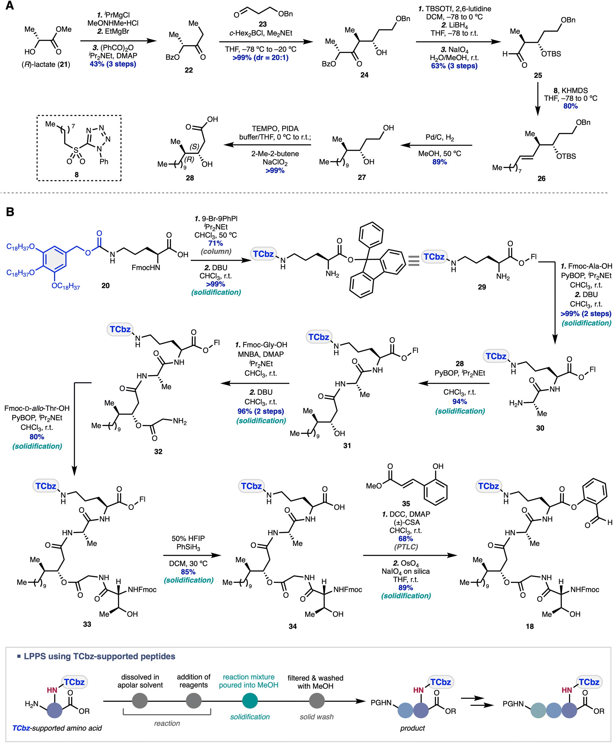 | Scheme 3 Western fragment synthesis. (A) Diastereoselective synthesis of the fatty acid fragment in an enantiospecific fashion. (B) TCbz group-enabled LPPS to elaborate the desired western fragment. The typical procedure for our LPPS is shown in the gray box. | |