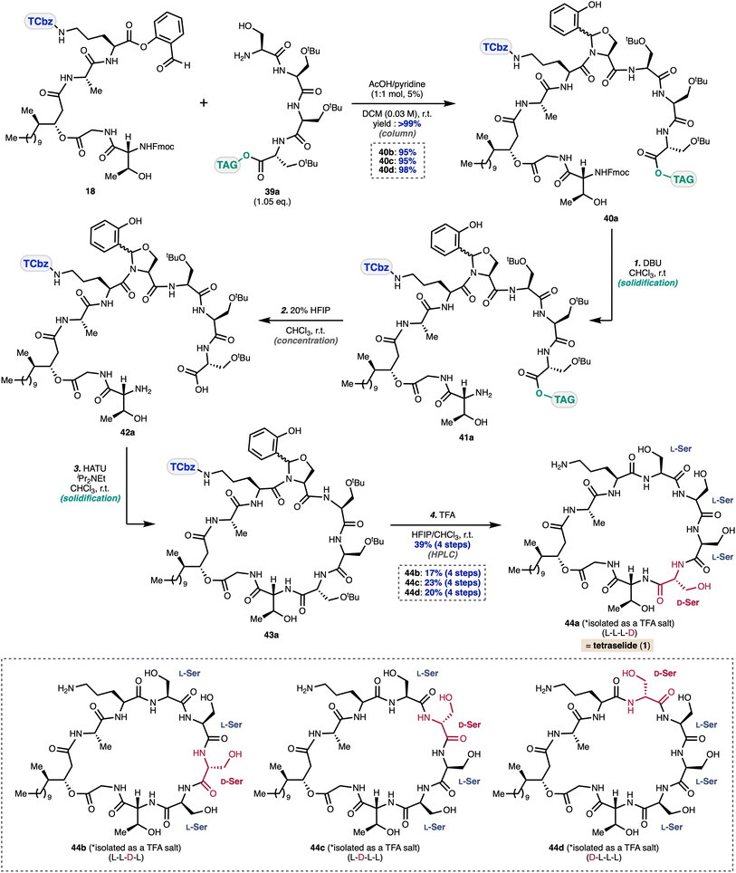1 mol mol−1) in DCM (0.03 M) gave rise to the desired coupled product 40a in quantitative yield as a diastereomeric mixture of the N,O-acetal moiety.43 Remarkably, the STL reaction proceeded efficiently with only a slight excess (1.05 eq.) of 39a without epimerization of the peptide backbone. This highlights the power of convergent LPPS strategy under the homogeneous reaction conditions.