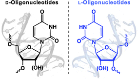 Nucleic acids, as chiral molecules, have enantiomers known as L-nucleic acids (Fig. 1). L-Oligonucleotides (ONs) offer unique advantages compared to their native counterparts. One of the most notable features is their resistance to nucleases, providing remarkable biostability even under harsh biological conditions, including within living organisms.1–3 Additionally, L-ONs exhibit identical hybridization thermodynamics and kinetics to their native counterparts, allowing for easy adaptation without further optimization.4,5 Furthermore, L-ONs cannot form Watson–Crick (WC) base pairs with native nucleic acids, significantly reducing the potential for in vivo off-target effects.2,6,7 These properties have led to the increasing use of L-ONs in various biomedical technologies, including diagnostic biosensors,8,9 aptamers,10–14 live cell imaging probes,15–18 and drug delivery agents.19,20 Notably, L-aptamers (also referred to as Spiegelmers) have shown promise as drugs, with several examples currently undergoing clinical trials.21
