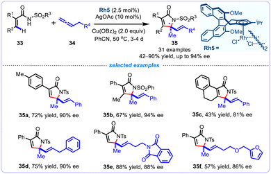 Encouragingly, Cramer's group further realized an enantioselective alkenyl C(sp2)–H functionalization/cyclization of diverse acryl amides 33 with varied allenes 34 enabled by a chiral iPr-bearing trisubstituted CpxRhIII catalyst, allowing the straightforward synthesis of enantioenriched α,β-unsaturated γ-lactams 35 bearing a quaternary stereocenter in excellent enantioselectivity of up to 94% ee (Scheme 13).38 Combination of CpxRhIII catalyst, AgOAc additive, Cu(OBz)2 oxidant in PhCN at 50 °C, a broad range of acryl amides bearing diverse synthetically useful functional groups could be annulated smoothly to produce chiral functionalized 2H-pyrrol-2-ones in generally satisfactory yields (42–90%). Remarkably, the challenging cyclic 2,3-disubstituated acrylamide was also compatible substrate with this stereospecific protocol, and could be converted into a tricyclic lactam in a moderate 43% yield. Noteworthy, the allene substrates serve as C1 fragments to undergo this formal [4 + 1] annulation reaction.