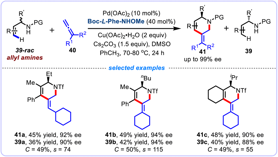 The direct and practical synthesis of chiral products through asymmetric C–H functionalization reactions can also be carried out using kinetic resolutions (KRs) strategy. In 2014, Yu et al. pioneered to investigate the feasibility of such conceptually innovative strategies, and reported an unprecedented palladium(II)-catalyzed enantioselective C–H iodination of racemic benzylic amine substrates.40 They further expanded to establish the highly efficient kinetic resolution processes for the enantioselective C–H arylation of racemic nosyl-protected benzylamines,41 and enantioselective C–H olefination of racemic α-hydroxy and α-amino phenylacetic acids.42 Later in 2021, Gulías and co-workers investigated the asymmetric alkenyl C(sp2)–H activation reactions using kinetic resolution strategy, and elegantly established an efficient atom- and step-economical protocol for the asymmetric Pd(II)-catalyzed alkenyl C(sp2)–H activation/[4 + 2] annulation of racemic α-branched allyltriflamides 39-rac with allenes 40 in the presence of Boc-L-Phe-NHOMe as the ligand (Scheme 15).43 This kinetic resolution strategy features efficient kinetic resolutions (selectivity values of up to 127) and excellent enantioselectivities (up to 99% ee), providing access to a series of enantioenriched chiral piperidine derivatives 41 associated with optically active allyl amines. The value of this strategy has been reinforced by further derivatizations of the thus-obtained chiral tetrahydropyridines, which could be readily converted into a variety of value-added azacycles and different nitrogenated compounds.