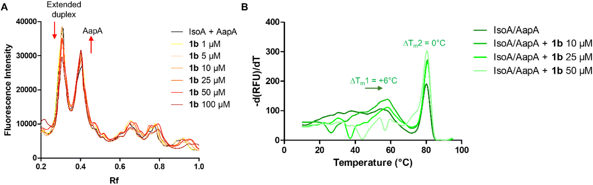 To explore the interaction mechanism of compound 1b, we performed differential scanning fluorimetry (DSF) experiments in which variations in the melting temperatures (Tm) of each structure are evaluated. When individually structured full-length AapA1 and IsoA1 RNAs were mixed they showed multiple transitions between 30 and 40 °C together with a major one at 55.0 °C and one at 79.0 °C (Fig. 5B, dark green line). Based on the individual DSF profiles (Fig. S7†), these two peaks correspond to the melting of the stem-loop structures and the extended duplex, respectively. In the presence of compound 1b, a ΔTm stabilization of +4.5 °C was observed for the peak at 55.0 °C that shifted to 59.5 °C while the extended duplex stability remained unaffected. This suggests stabilization of the stem-loop structures that inhibits the formation of the extended duplex, thus inducing the inhibition activity. Neomycin exhibits a very different behavior since it stabilizes all observed structures including the duplex (Fig. S7†). These results were also confirmed using the truncated IsoA1 and AapA1 sequences used for anisotropy and affinity experiments (Fig. S8–S10†). In this context, neomycin strongly stabilizes both the duplex (+7.0 °C) and the separate stem loops (+6 °C to +9 °C) while compound 1b stabilizes the stem-loop structures without affecting the duplex as observed for the full-length sequences.