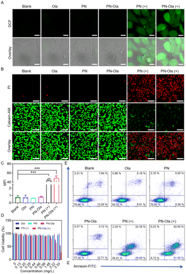 | | Fig. 3 Anti-proliferation ability of PN-Ola. (A) CLSM images of 4T1 cells treated with Ola, PN, and PN-Ola with or without light irradiation, using DCFH-DA as the indicator. Scale bar: 10 μm. (B) CLSM images and (C) mean fluorescence intensity (MFI) analysis of 4T1 cells after live/dead cell staining following treatment with Ola, PN, and PN-Ola in the presence or absence of light irradiation. Scale bar: 100 μm. (D) Viability of 4T1 cells after treatment with Ola, PN, and PN-Ola, with or without light irradiation. (E) Apoptosis analysis of 4T1 cells by flow cytometry after treatment with Ola, PN, and PN-Ola under dark or light irradiation (8 min). Light irradiation is denoted by “+”. ***P < 0.001 was determined by a Student's t-test. | |