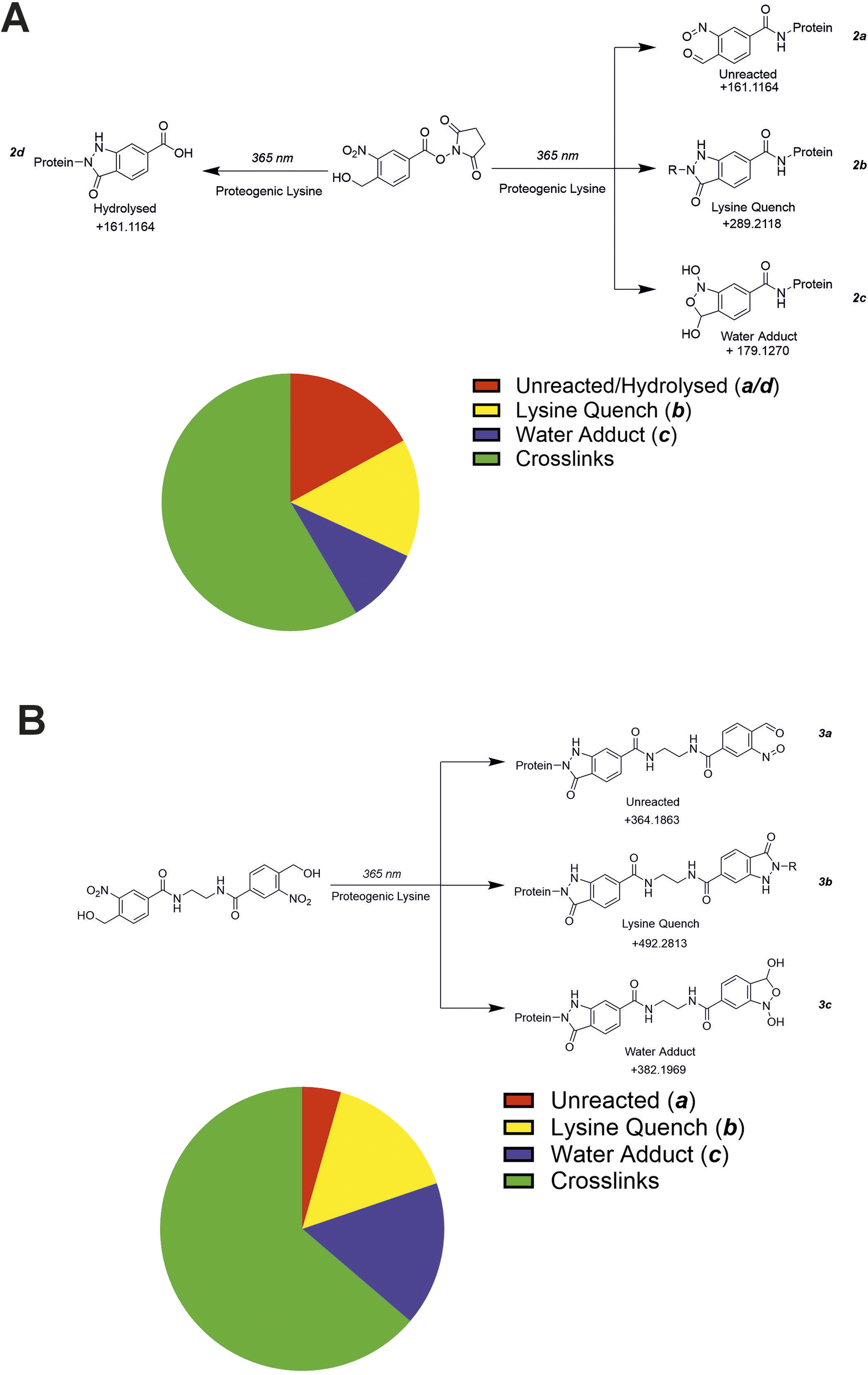 Traditional chemical crosslinkers typically target lysine residues due their high intrinsic nucleophilicity and prevalence. The majority of crosslinkers are homo-bifunctional and comprise two N-hydroxy succinimide esters (NHS-esters) as lysine-reactive groups, which react with high efficiency under physiological conditions.9 However, due to the NHS-ester being constitutively active, reactions are always initiated at the point of crosslinker addition. As a result, there is very little temporal control of the crosslinking reaction. This also renders NHS-ester based crosslinkers liable to hydrolysis, resulting in the formation of ‘mono-links’ (where one of the reactive groups is hydrolysed into an acid that can no longer react with a lysine side-chain). Due to the uncertainty of whether or not the hydrolysis of an NHS-ester has occurred before or after the other NHS-ester had reacted with lysine, mono-links do not deliver the same level of structural information as crosslinks.10