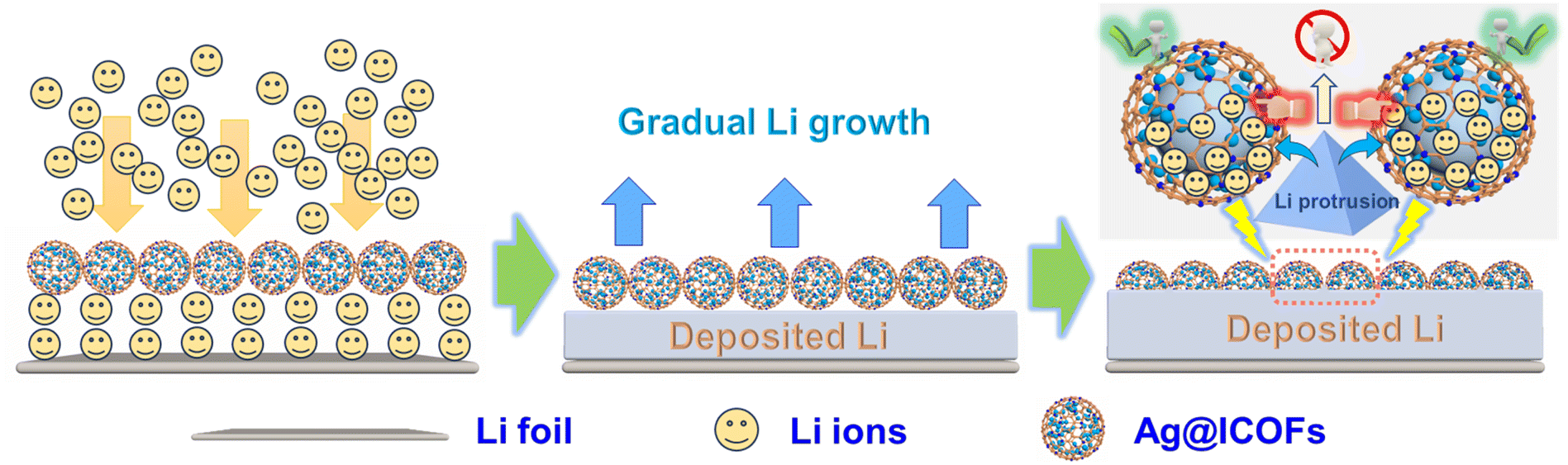 Differing from these studies, mainly focusing on the optimization of dendrite formation in the initial stage and ignoring the dendrite issue once the vertical Li tendency occurs, in this work, a hybrid interfacial layer, lithiophilic hollow nanospheres assembled from imine-based covalent organic framework (ICOF) layers and built-in Ag sites (Ag@ICOFs), is constructed and proved to be capable of guiding dendrite-free lithium deposition (Scheme 1). On the one hand, hollow ICOF nanospheres actualize enough exposure of lithiophilic functional groups such as CN linkages and aromatic rings, which can bind lithium ions and promote uniform distribution on the electrode surface, effectively avoiding the locally concentrated lithium growth. On the other hand, the internal decoration of Ag nanoseeds helps improve the conductivity, achieving rapid electron migration in Ag@ICOFs. More importantly, once deposited, lithium shows protrusion development, and lithiophilic Ag can guide directional nucleation and break vertical growth, further alleviating the dendrite formation. By conducting in/ex situ measurements, the superior capabilities of guiding homogenous and flat Li deposition and reducing the side reaction of electrolyte loss have been proved, positively verifying the rational protection design for lithium metal anodes. Depending on these positive effects, the Ag@ICOFs covered electrode exhibits an improved coulombic efficiency (CE) of 99.4% for 400 cycles and a long lifespan of 1900 h for a symmetric cell at 0.5 mA cm−2. Moreover, the full cells comprising Ag@ICOFs covered lithium anodes and LiFePO4 cathodes can obtain an ultrahigh capacity of 101.8 mAh g−1 (capacity retention ratio: 87.3%) after 1000 cycles at 5C. This work offers a promising insight into the exploitation of novel composite ASEI layers.