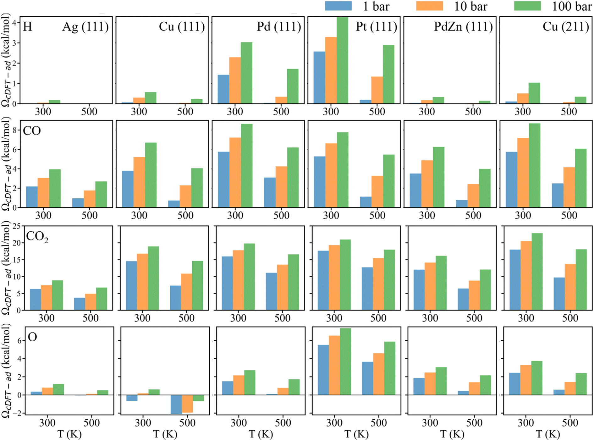 It is important to note that both gas adsorption and surface coverage are sensitive to temperature, pressure, and gas-phase bulk composition. In traditional KS-DFT calculations, the pressure and composition effects are corrected using the equations for an ideal-gas mixture. Specifically, the pressure correction is implemented by subtracting RT