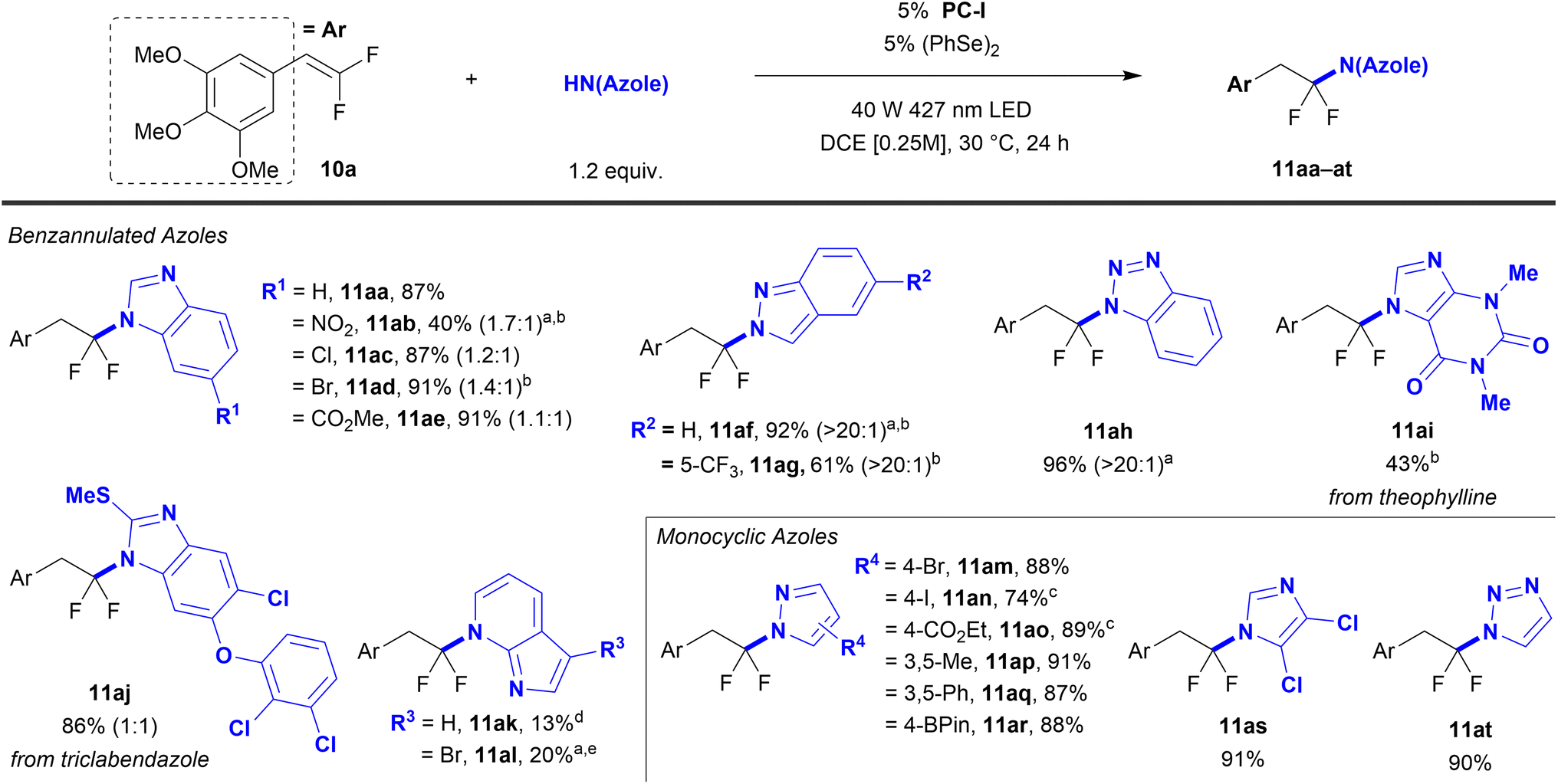 A range of azoles successfully reacted with gem-difluorostyrene 10a using the optimized PC-I conditions (Table 2). Specifically, unsubstituted benzimidazole reacted to afford product 11aa in 87% yield. 5-Monosubstituted benzimidazoles bearing electron-withdrawing –Cl, –Br, –CO2Me, and –NO2 groups reacted with moderate to excellent yield (11ab–ae, 40–91%). A mixture of N-regioisomers was generated, but the 6-substituted products predominated, for which the major regioisomer was assigned by a combination of X-ray crystallography (see Data availability on p. 8) and 1H{19F} Nuclear Overhauser Effect (NOE) NMR. Other benzannulated azoles, such as indazoles (11af and 11ag, 92% and 61%) and benzotriazole (11ah, 96%) reacted with good yield and near exclusive regioselectivities. Notably, the high N2-regioselectivity for indazoles 11af and 11ag supports a process involving nucleophilic C–N bond formation from a neutral indazole molecule.50 Additionally, the FDA-approved drugs theophylline and triclabendazole were reacted with these conditions (11ai and 11aj, 43% and 86%). 7-Azaindoles also coupled successfully with slight alterations to the standard conditions, albeit in low yields and with long reaction times (11ak and 11al, 13% and 20%, 46 h and 44 h). Interestingly, these reactions exhibit exclusive N-regioselectivity for functionalization at the pyridyl nitrogen rather than the indole nitrogen, which is consistent with the observed inability of indoles to react in this system. However, 6-, 5-, and 4-azaindoles do not achieve net hydrofunctionalization and instead form monofluorovinyl azaindole products (ArCH = CFN(azaindole), 7).
