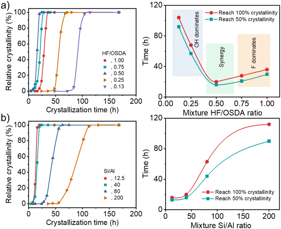 Under all conditions described above, we were able to crystallize beta zeolite in pure form (Fig. S1). However, the kinetics study (Fig. 1a) showed that while at the standard HF/OSDA ratio of 1.00, fully crystalline beta was obtained in 48 h, HF/OSDA = 0.50 led to a faster synthesis time (20 h). Unexpectedly, a further ratio decrease to 0.13 resulted in a considerable increase in synthesis time (ca. 5 days). It thus appears that when none of the mineralizers prevails, there is a synergistic effect (Fig. 1a, right) that maximizes the beta zeolite nucleation and growth rates, while this effect is lost upon predominance of one mineralizer (F− at close to neutral pH and OH− at alkaline pH (HF/OSDA ≤ 0.25), respectively; see below). We also investigated the crystallization kinetics of synthesis mixtures with a fixed HF/OSDA optimum ratio (0.50) but different Si/Al ratios (12.5–∞). Interestingly, the larger the Al content in the synthesis mixtures, the shorter the crystallization time, which is opposed to the trend observed for the synthesis under standard fluoride conditions (Fig. 1b),19 again demonstrating the synergistic effect of the fluoride-deficient approach. We also note that not only does the “induction period” (the time before any powder X-ray diffraction (PXRD) crystallinity is observed) become longer, but also the crystallization rate slows as the Si/Al ratio increases. As a result, a pure-silica (Si/Al = ∞) synthesis mixture with HF/OSDA = 0.50 was found to remain amorphous even after heating at 140 °C for 2 weeks, although it yielded a mixture of beta and ZSM-5 after prolonged heating for 3 weeks. This suggests that the counterbalance of OSDA cations by single framework negative charges (i.e. [AlO4/2]− tetrahedra) is more favorable than by connectivity defects.