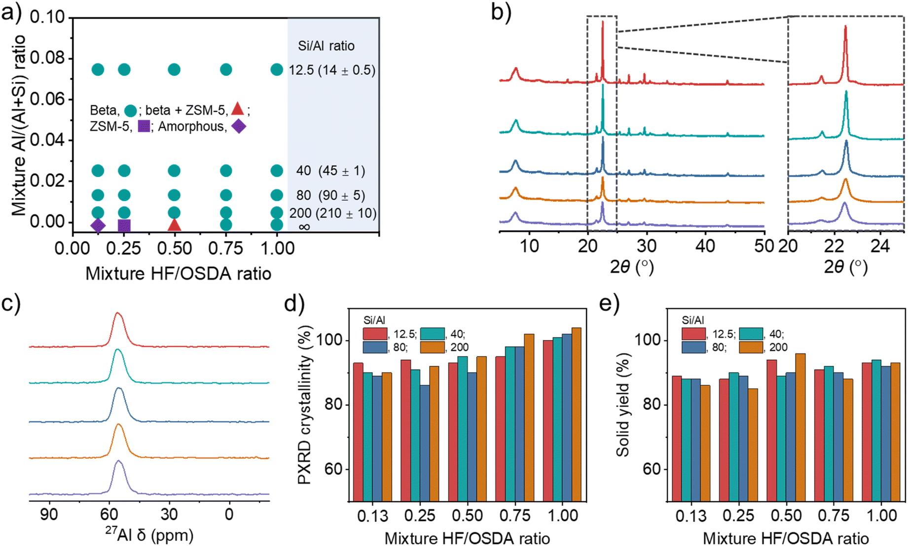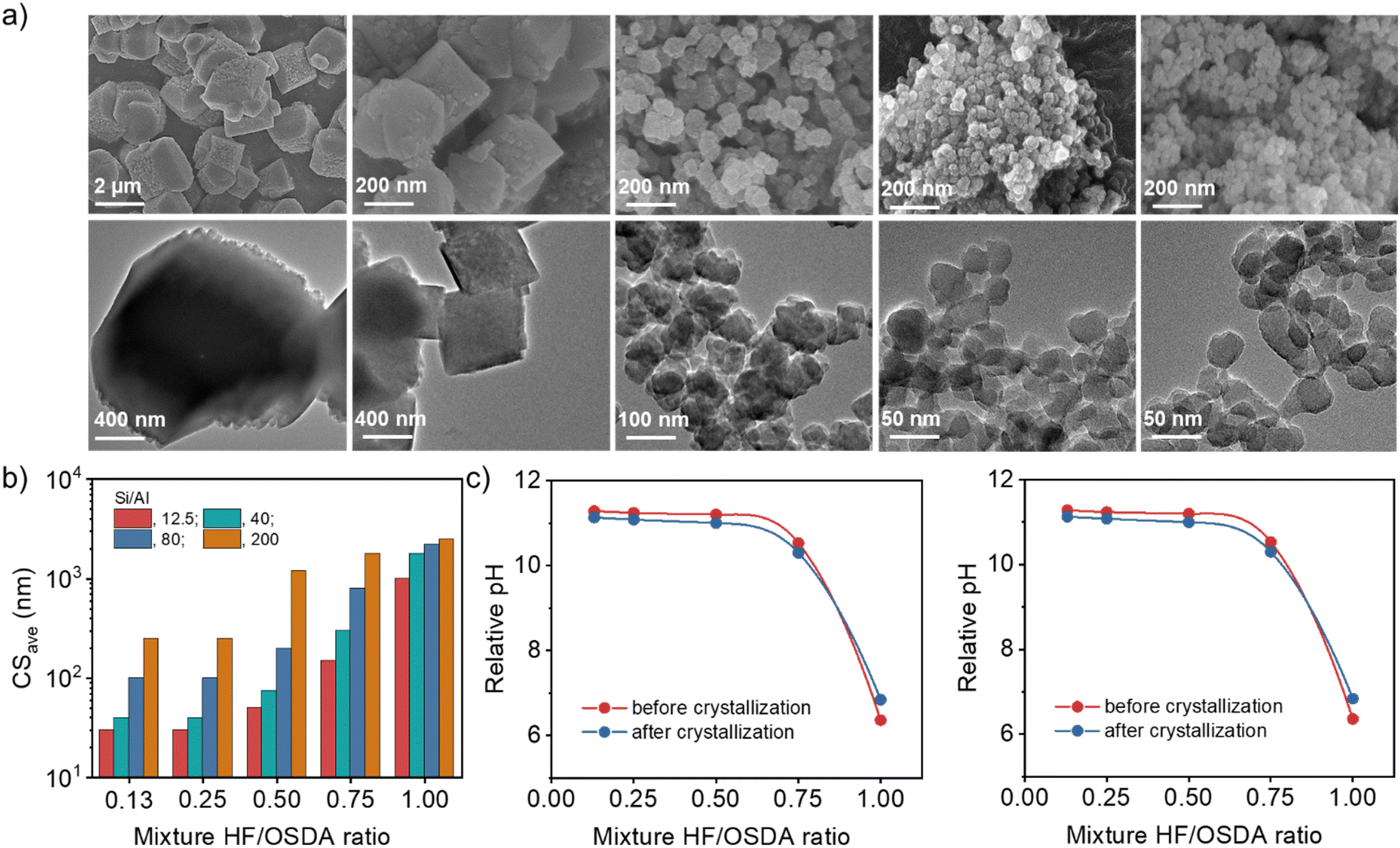 Fig. 3a shows the FE-SEM and TEM images of a series of beta zeolites synthesized at the same Si/Al ratio (40) but different HF/OSDA ratios (0.13–1.00), where no amorphous phase is evident. As the HF/OSDA ratio in the starting mixture decreases from 1.00 to 0.25, the crystals become significantly smaller (from ca. 1800 to 40 nm), less faceted and thinner, but are still discrete. No additional decrease in average crystal size was caused by further decreasing the HF/OSDA ratio to 0.13 (Fig. 3b). The observation holds at other Si/Al ratios (Fig. S8). For example, the mixtures with Si/Al = 12.5 and 80 gave the smallest beta crystals (30 and 100 nm, respectively) at HF/OSDA = 0.25, although considerably bigger ones (ca. 250 nm) were obtained at Si/Al = 200 and HF/OSDA = 0.25 (Fig. 3b). Decreasing the HF/OSDA ratio to 0.13 led to no further decrease in size, at any given Si/Al ratio. It thus appears that while there is a critical level of F− concentration (HF/OSDA ≤ 0.25) in the starting mixture leading to the smallest crystal size, the average size of the smallest beta crystals increases with increasing the mixture Si/Al ratio.
