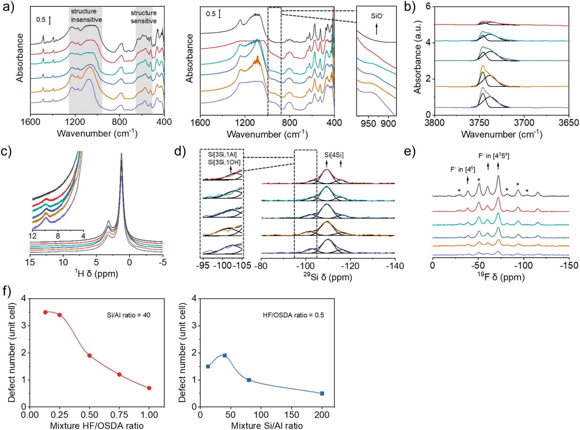 Si–OH and SiO− groups may arise from two origins: terminal groups (increasing as the crystal size decreases) and internal groups that may be necessary for charge balance when the concentration of fluoride decreases and that usually appear in about a fourfold excess.36 It has been repeatedly shown that, for materials prepared by the fluoride route, the beta unit cell retains six TEA+ ions, regardless of the framework Si/Al ratio,33,46,47 and thus a maximum of six F− anions at pure-silica composition. As Al is incorporated into the beta framework, the number of F− ions should decrease because of the counterbalance of OSDA cations by [AlO4/2]− tetrahedra. Table 1 compares the unit cell compositions of as-made beta-40-n and beta-m-0.50, where m = Si/Al = 12.5–200, which were determined from a combination of elemental and thermal analyses and 19F MAS NMR spectroscopy (Fig. 4e and S14–S15). The former series of zeolites have essentially the same number (Si/Al = 45 ± 1) of Al atoms and TEA+ cations, around 1.4 and 6.0, respectively, per unit cell, while the F− concentration decreases from 3.9 to 0.9 per unit cell with decreasing n from 1.00 to 0.13, leading to more and more OH− ions, actually representing SiO− defects, introduced in Table 1 for charge balance. The variation of Al atoms, TEA+ cations and F− concentration in the latter series of zeolites also caused the difference in the concentration of SiO− in each unit cell. To better understand the change, we plotted SiO− number per unit cell of the beta zeolites with respect to the HF/OSDA and Si/Al ratios in the synthesis mixture (Fig. 4f). We note that the SiO− defect concentration significantly increases in the beta zeolites as the HF/OSDA ratio decreases and the maximum concentration can reach ca. 3.5 per unit cell when the HF/OSDA ratio decreases to 0.25. In addition, at a fixed HF/OSDA ratio of 0.50, the SiO− defect number varies with the Si/Al ratio, and the maximum value appears in the beta zeolite obtained using a synthesis mixture with a Si/Al ratio of 40.