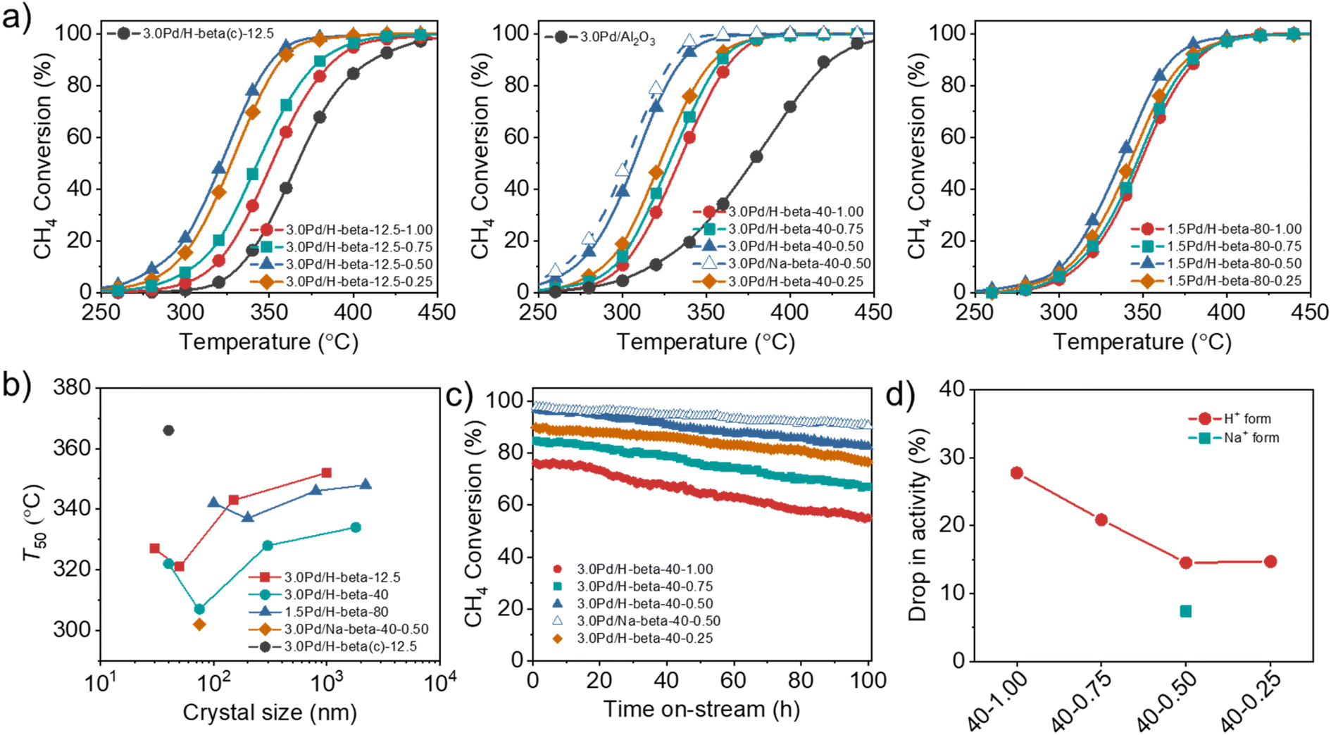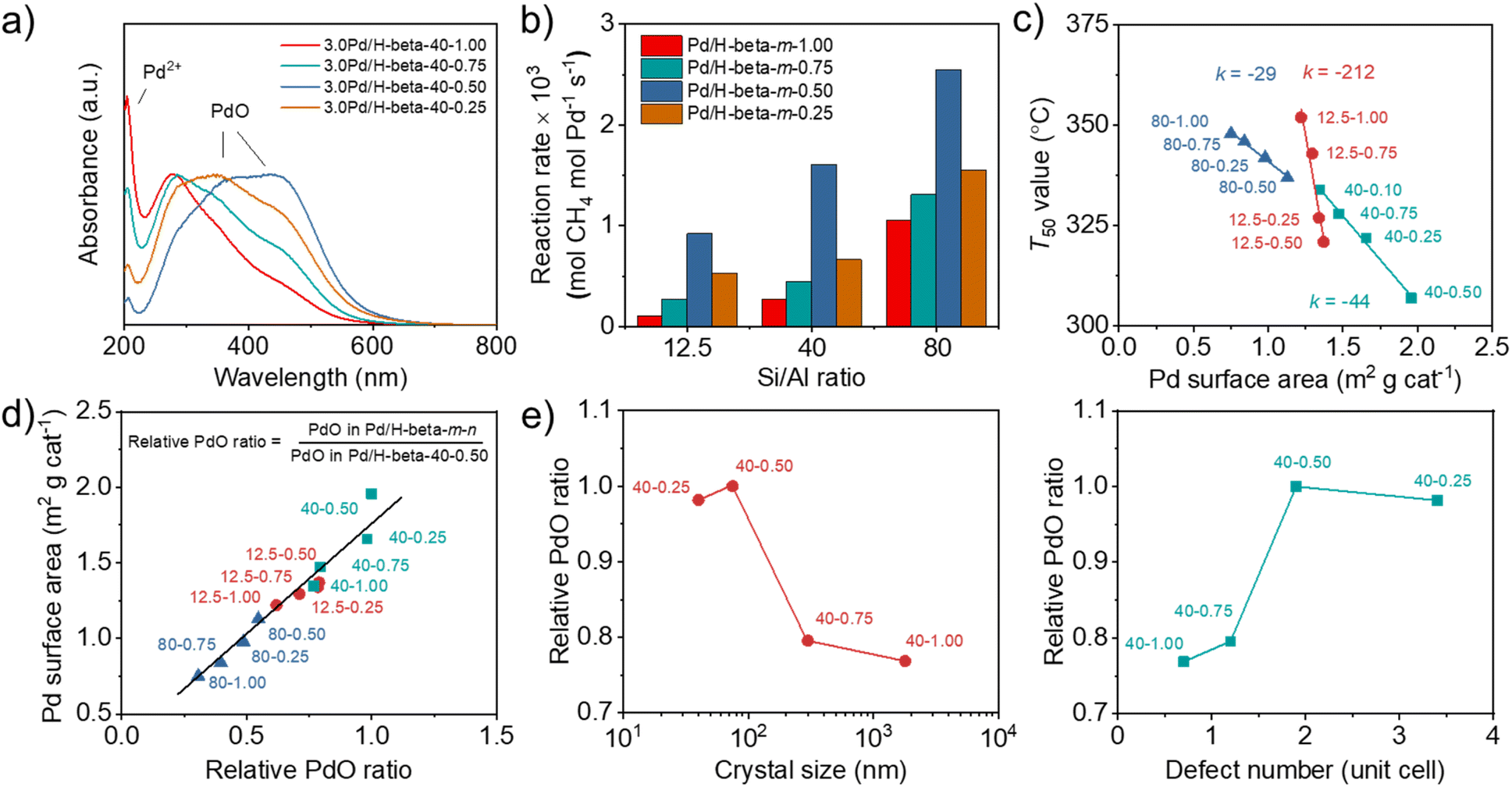 We also compared the Pd surface areas of Pd/beta catalysts, determined using pulse CO chemisorption, with their respective T50 values (Fig. 7c). When the support Si/Al ratio is similar, the T50 value decreases linearly with increasing Pd surface area. More interestingly, the rate of T50 decrease was found to be smaller at a higher support Si/Al ratio. Since each series of Pd catalysts under comparison has similar support Si/Al ratios and Pd loadings but different average support crystal sizes (Fig. 2a, 3b and Table S2), the effects of support crystal size on the T50 value appear to be less significant at a higher support Si/Al ratio. We also determined the relative PdO ratios of all Pd/H-beta-40-n catalysts from O2 TPD (Fig. S25) by dividing the peak area of each catalyst by that of 3.0Pd/H-beta-40-0.50 and plotted them against their Pd surface areas (Fig. 7d). A linear relationship between these two quantities again shows that PdO is a major low-temperature (< 400 °C) active center for wet CH4 combustion.