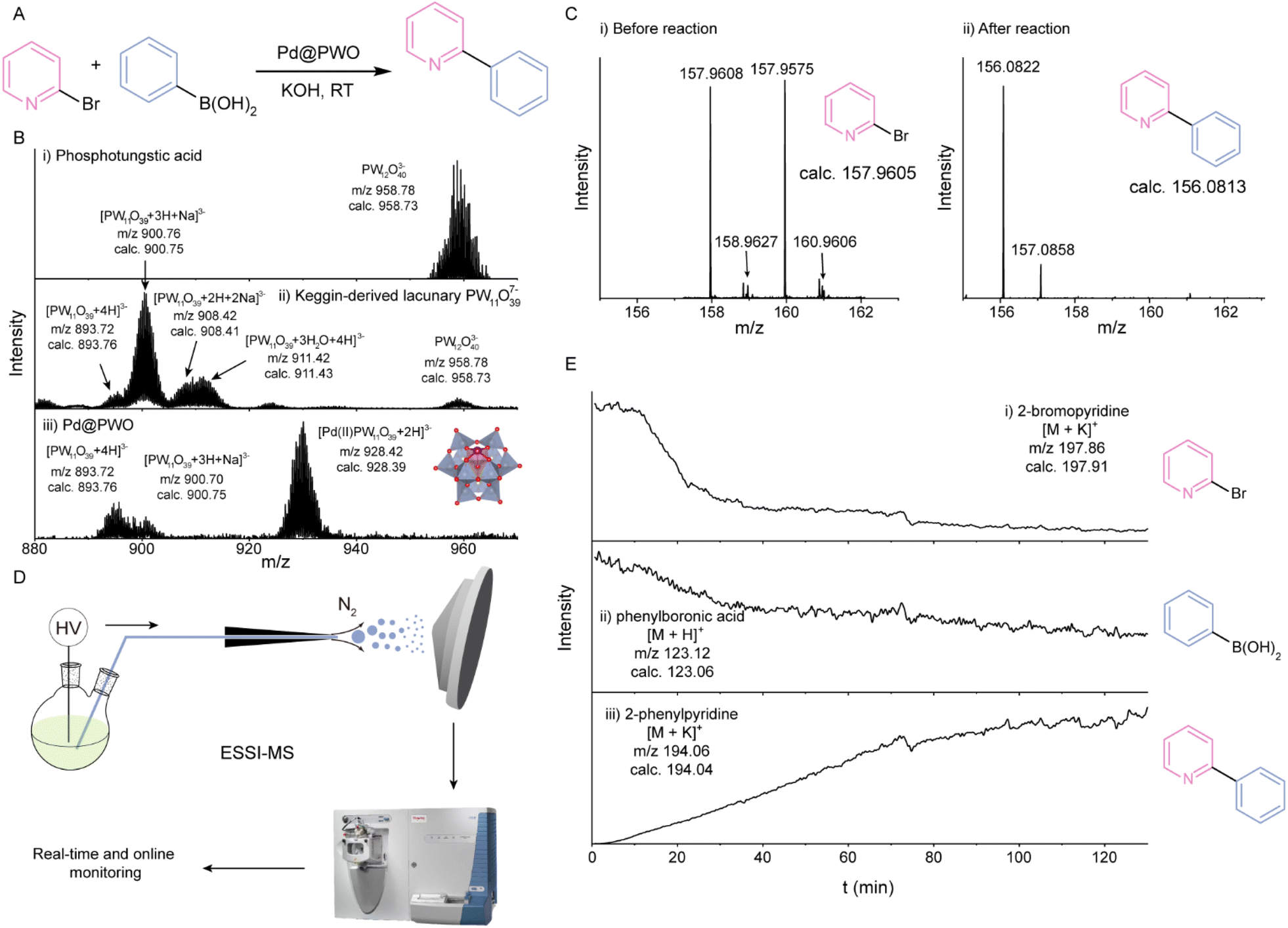 | | Fig. 1 Confirmation of Pd@PWO construction and the feasibility of SMCC catalysis. (A) SMCC reaction between 2-bromopyridine and phenylboronic acid to generate the 2-phenylpyridine product was carried out at room temperature (RT) in methanol. (B) Mass spectra of phosphotungstic acid (i), Keggin-derived lacunary PWO (ii), and Pd@PWO (iii). (C) High-resolution mass spectrum of the reaction system before (i) and after the SMCC reaction (ii) for 2 h. (D) Diagram of the ESSI instrument for online monitoring of the SMCC reaction. (E) The extracted ion chromatograms (EICs) of 2-bromopyridine (m/z 197.86) (i), phenylboronic acid (m/z 123.12) (ii), and 2-phenylpyridine (m/z 194.06) (iii) during the SMCC reaction. | |