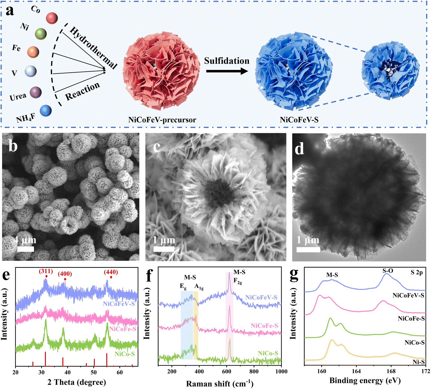 The structural and compositional characteristics were analyzed using X-ray diffraction (XRD). As illustrated in Fig. S14, the XRD pattern of the NiCoFeV–OH precursor confirmed the formation of a single-phase high-entropy hydroxide precursor. Furthermore, both NiCoFe–OH and NiCo–OH exhibit diffraction peaks that are characteristic of typical hydroxides and consistent with those of NiCoFeV–OH (Fig. S15), thereby confirming the reliability of the synthesis method for producing a single-phase high-entropy hydroxide precursor. After the sulfidation process, the characteristic peaks observed in the XRD spectra of NiCo–S, NiCoFe–S, and NiCoFeV–S exhibited strong alignment with the standard CoNi2S4 (PDF #24-0334) (Fig. 1e).47,48 Specifically, peaks at 31.5°, 38.2°, 41.7°, 50.3°, and 55.3° were attributed to the (311), (400), (331), (511), and (440) planes, respectively, indicating that NiCoFeV–S is a single phase without any detectable impurities. This sulfide structure enables the disorderly and uniform distribution of each metal element. Moreover, the crystalline structure and chemical component of NiCoFeV–S were further studied by Raman spectra with NiCoFe–S and NiCo–S as a comparison. The spectra of NiCoFeV–S, NiCoFe–S, and NiCo–S displayed similar peaks, suggesting the synthesized catalysts were composed of identical single-phase sulfide structures (Fig. 1f). In particular, the peaks at ∼280–340 and ∼380 cm−1 were attributed to Eg and A1g modes, respectively, while the band around 620 cm−1 was associated with the F2g mode of M–S.49 The observation that the peak at 619.8 cm−1 of NiCoFeV–S exhibited a left shift compared to those of NiCoFe–S (622.2 cm−1) and NiCo–S (624.7 cm−1), consistent with the hypothesis that interstitial atoms are present after metal doping, as evidenced by the phenomenon of lattice expansion and in line with the TEM results.49,50 The Raman analysis further validated the single-phase structure of NiCoFeV–S, showing consistency with the TEM and XRD results.