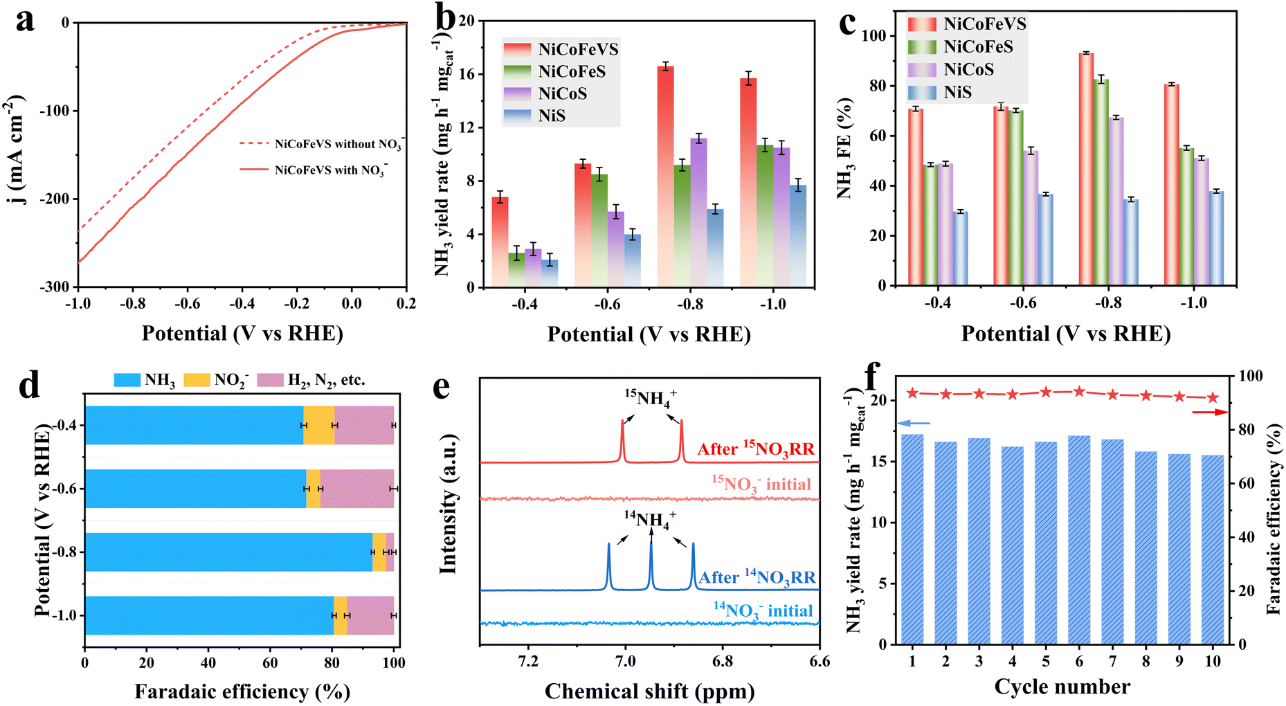 The catalytic performance of the catalysts was investigated in a three-electrode H-type cell toward NO3− electroreduction at 25 °C. The LSV curves were sequentially compared with and without KNO3 with a scan rate of 5 mV s−1 to preliminarily study the NO3RR catalytic activity. NiCoFeV–S with NO3− exhibits significantly enhanced cathodic current compared to that in the absence of NO3−, indicating the high NO3RR activity of NiCoFeV–S. Moreover, the current increases with the incorporation of metal (Fig. 3a and S30), which demonstrates that the synergistic effect in NiCoFeV–S effectively contributes to the improved NO3RR performance. The electrolysis test was carried out at constant potentials from −0.4 to −1.0 V versus RHE for 2 hours in 1.0 M KOH solution containing 0.1 M KNO3. Following measurements, colorimetric techniques were used to determine the concentrations of products in the electrolyte. All the possible liquid products, including NO3−, NH3, and NO2−, were quantified by various colorimetric methods after plotting their standard calibration curves (Fig. S31–S33). The supplementary UV-vis spectra of NH4+ and NO2− after electrolysis at various potentials for the NiCoFeV–S, NiCoFe–S, NiCo–S, and Ni–S catalysts are provided in Fig. S34 and S35. Remarkably, NiCoFeV–S delivered an excellent NH3 yield of 16.6 mg h−1 mgcat.−1 at −0.8 V vs. RHE, compared to NiCoFe–S (9.2 mg h−1 mgcat.−1), NiCo–S (11.2 mg h−1 mgcat.−1), and Ni–S (5.9 mg h−1 mgcat.−1) (Fig. 3b). A correspondingly high NH3 FE of 93.2% was achieved by NiCoFeV–S at −0.8 V vs. RHE (Fig. 3c), which is higher than those of NiCoFe–S (82.7%), NiCo–S (67.4%), and Ni–S (34.6%). Moreover, the NH3 FE of NiCoFeV–S was the highest across various applied potentials among the prepared catalysts, indicating that NiCoFeV–S exhibits superior NH3 selectivity (Fig. 3d and S36). The H2 quantitative experimental results via gas chromatography revealed a positive correlation between the applied potential and both the hydrogen evolution yield and faradaic efficiency across all catalysts, except for NiCoFeV–S. Notably, NiCo–S and Ni–S demonstrated superior hydrogen evolution rates (Fig. S37a) and faradaic efficiency (Fig. S37b), while NiCoFe–S exhibited intermediate performance at elevated applied potentials. In contrast, NiCoFeV–S displayed comparatively lower H2 rates and faradaic efficiencies, particularly at an applied potential of −0.8 V. These findings provide further evidence for the enhanced selectivity of NiCoFeV–S toward the nitrate-to-ammonia electroreduction reaction under the investigated potential conditions.