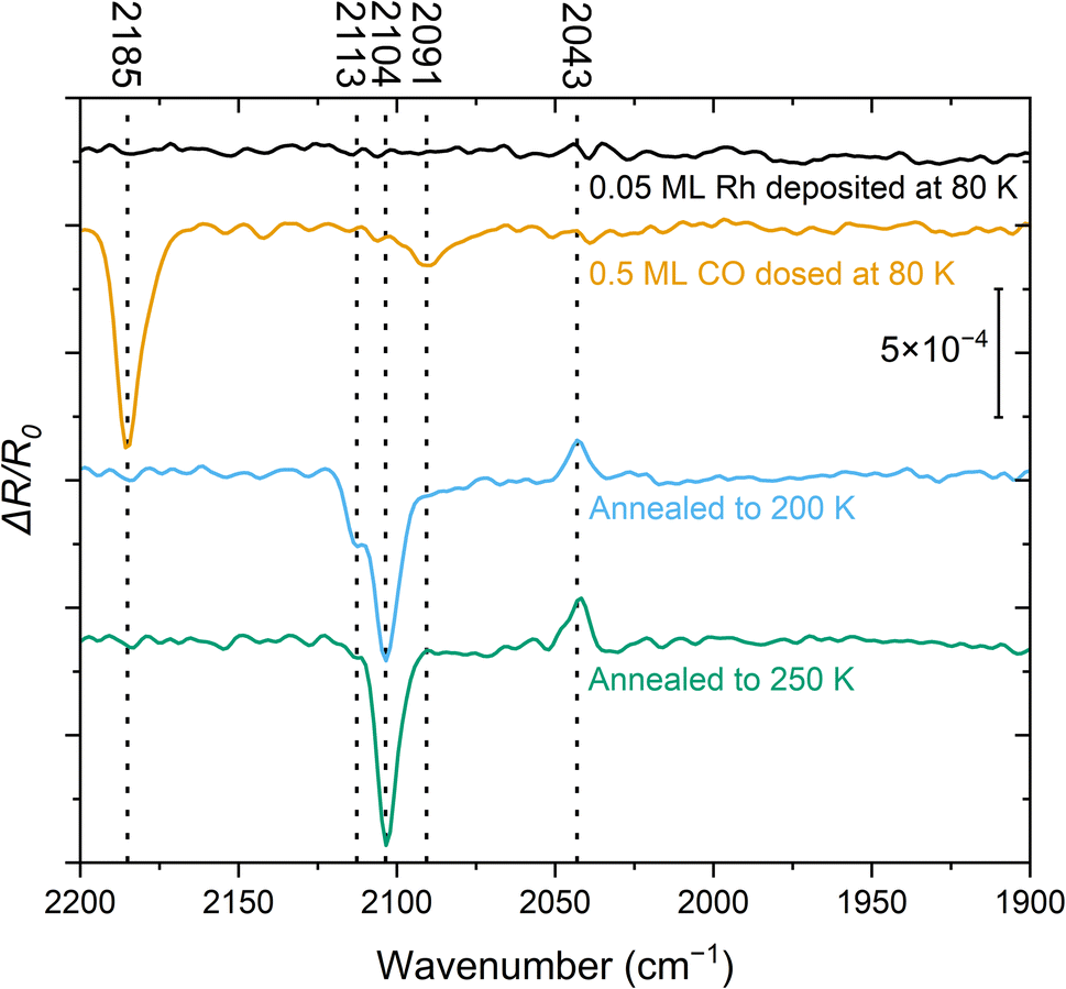 0] direction (an azimuthal orientation of the gem-dicarbonyl perpendicular to the Ti and O rows). When Rh dicarbonyls are measured on powders whose surfaces are randomly oriented, these two peaks are observed as two minima of the reflectance (maxima of absorbance) in IR spectra. However, our IR beam is reflected on a single crystal surface at a well-defined range of incidence angles, chosen such that the symmetric (2104 cm−1) and asymmetric stretch (2043 cm−1) result in a lower and higher reflectivity, respectively. This results from the orientation of the dipole moments and the Fresnel equations, as confirmed by simulations.25 Following annealing to 250 K (Fig. 1, green trace) the 2113 cm−1 feature disappears, while the other two signals associated with the gem-dicarbonyl remain. We cannot assign the peak at 2113 cm−1 to one certain species at this point, but we attribute it to a metastable Rh-carbonyl species.9,31 By annealing to room temperature and above (Fig. S1), the Rh dicarbonyls disappear and a band around 2020–2040 cm−1 emerges, where CO on metallic Rh is typically located.35 This is clear evidence that the previously observed Rh species have agglomerated to form CO-covered Rh clusters. While we have observed these vibrational frequencies of the carbonyl species most frequently in our experiments, we have occasionally observed a slight shift of 1–4 cm−1 towards higher wavenumbers. We ascribe this to differences in the preparation procedure, and to an enhanced number of adsorbates from the residual gas of the UHV chamber, interacting with the gem-dicarbonyls when the adsorbates are in close proximity to them.