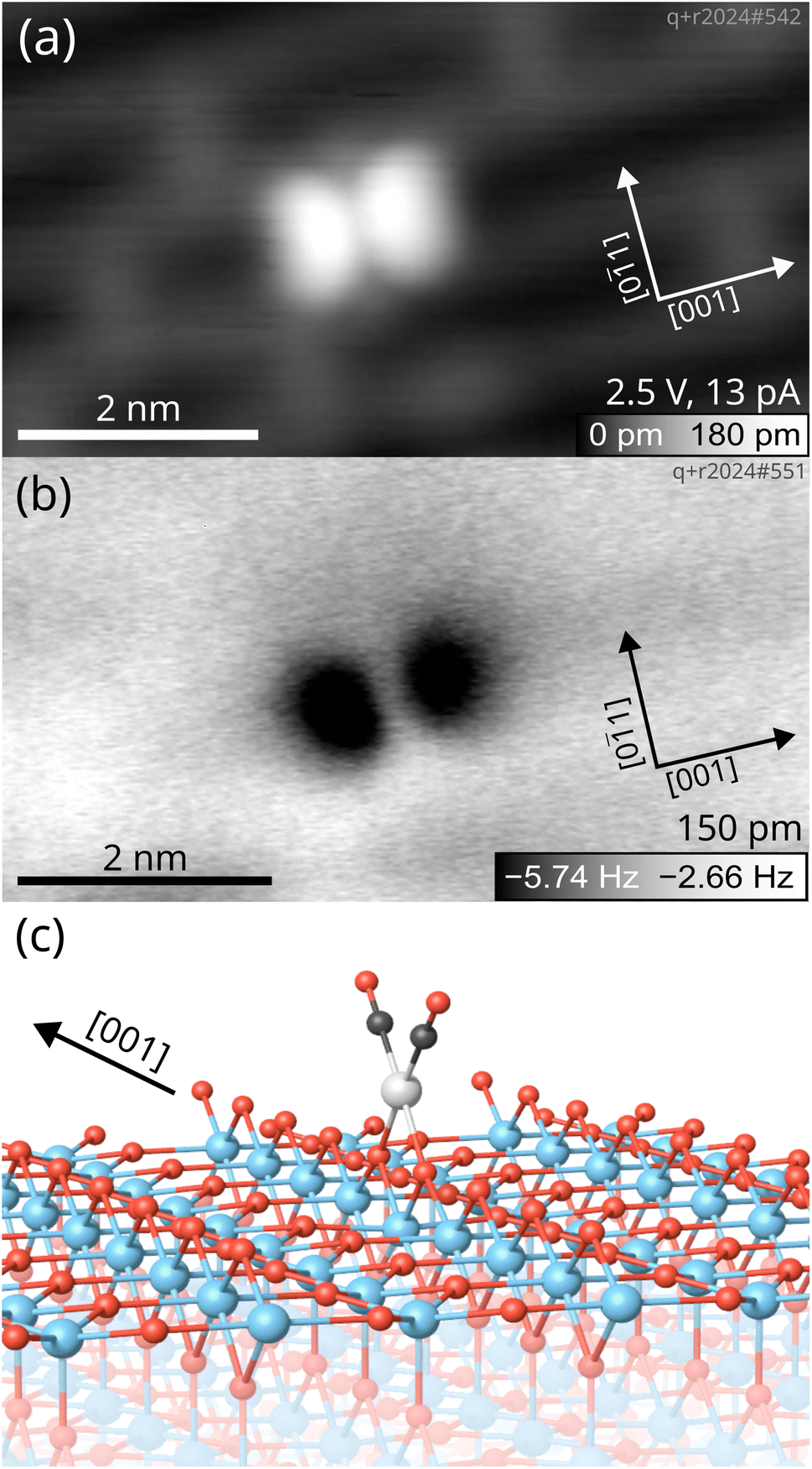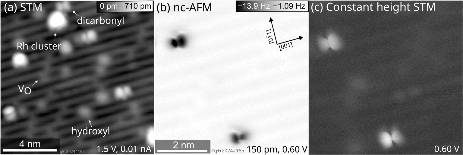 To further confirm the conformation of Rh gem-dicarbonyls, we employed low-temperature STM and nc-AFM. Fig. 2 presents microscopy images taken at a sample temperature of 14 K. The sample was prepared by depositing 0.05 ML Rh onto the TiO2(110) surface, followed by dosing 1 langmuir (L) of CO and annealing to ≈270 K. An overview scan is presented in Fig. S4.
