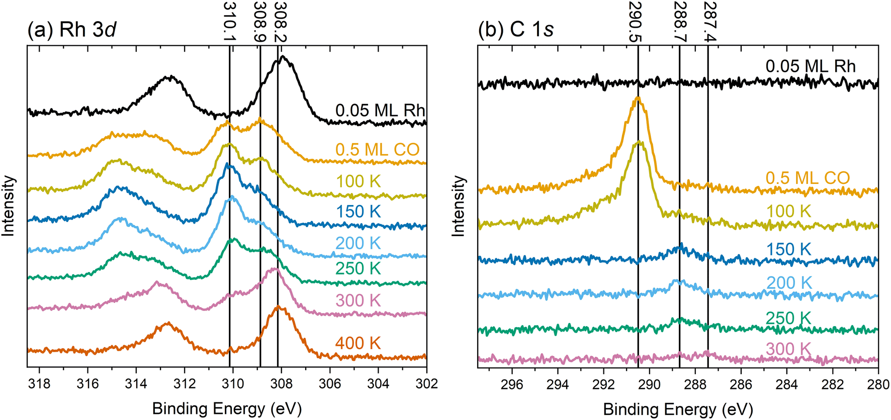 | | Fig. 4 XPS spectra of (a) the Rh 3d and (b) C 1s regions taken at 80 K using monochromatized Al Kα radiation at 70° grazing emission for enhanced surface sensitivity. The colored text corresponding to each spectrum indicates the treatment before the measurement. | |