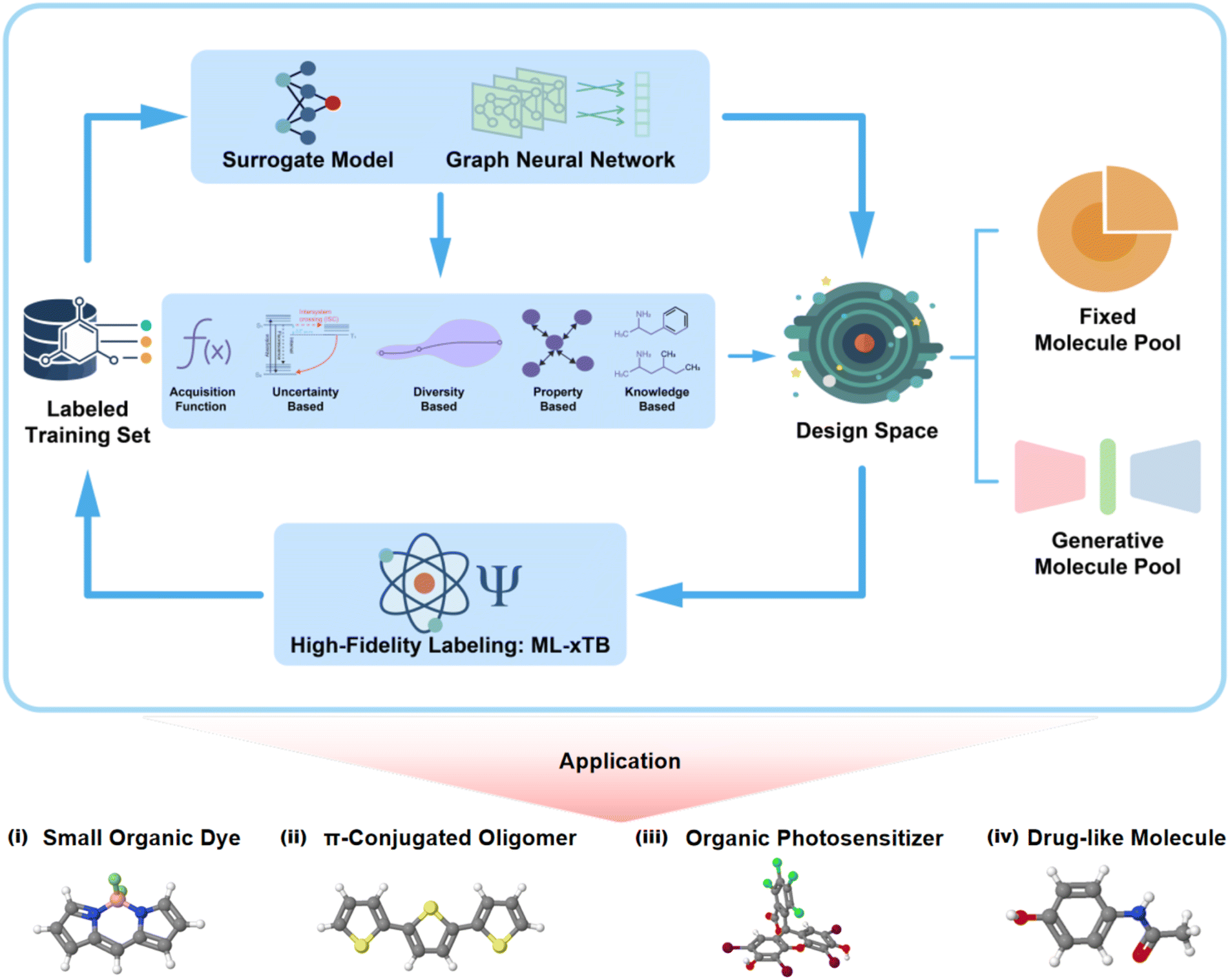 Building upon these directions, our study establishes a unified active-learning (AL) framework that extends beyond task-specific implementations and explicitly targets photosensitizer discovery. The framework integrates three tightly coupled components: (i) a large-scale ML–xTB-calibrated dataset of 655