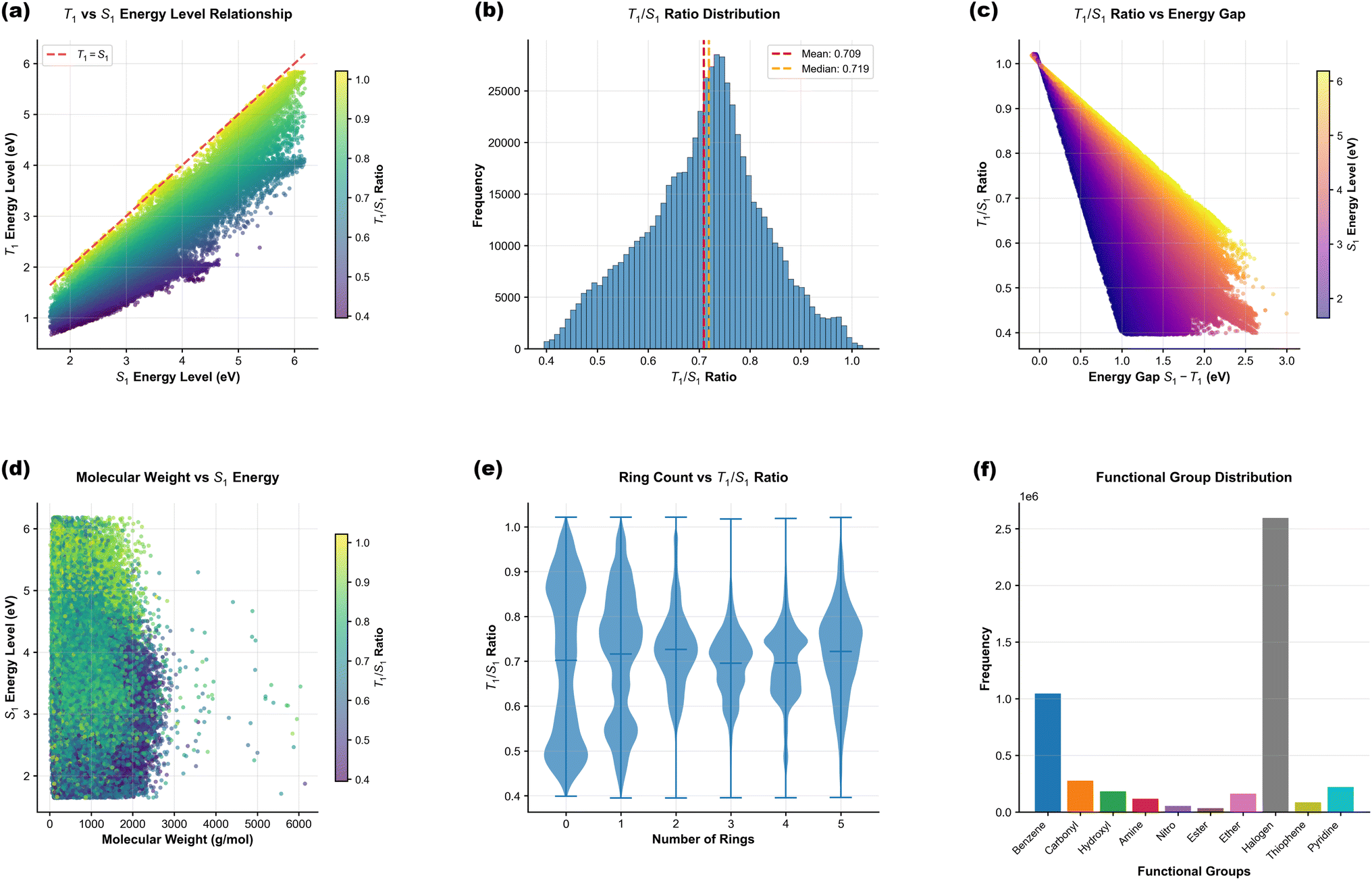 000 molecules, we expanded the library by integrating many diverse data sources (computational, experimental, and even patent-derived). We then predicted the lowest singlet and triplet energies (S1 and T1) for all candidates using our ML-xTB workflow, achieving DFT-level accuracy at 1% of the typical cost. We performed the analysis of the dataset in Fig. 3. (Full details of the datasets, including their names, references, and selection criteria, are provided in the SI (Text S5).)