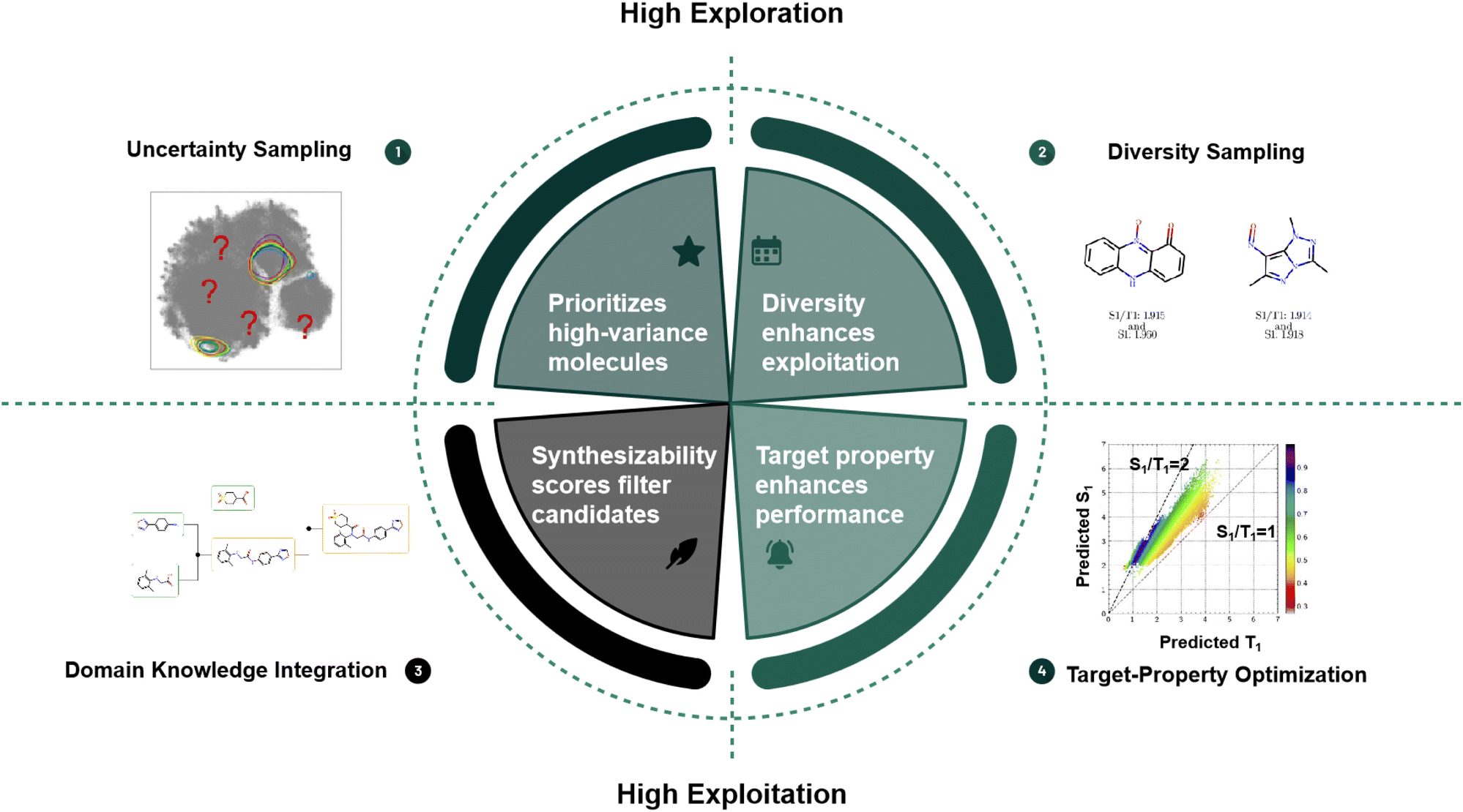 Uncertainty sampling prioritizes molecules that the model finds the most ambiguous, thus rapidly improving the model precision by identifying informative samples. Diversity sampling aims to maximize coverage of chemical space, ensuring structural heterogeneity and preventing redundancy. Target-property optimization selects molecules with extreme property values, facilitating efficient exploration of high-performance regions, but potentially neglecting broader chemical diversity. Lastly, synthesizability-guided sampling incorporates synthetic feasibility, prioritizing practical compounds that are experimentally accessible.