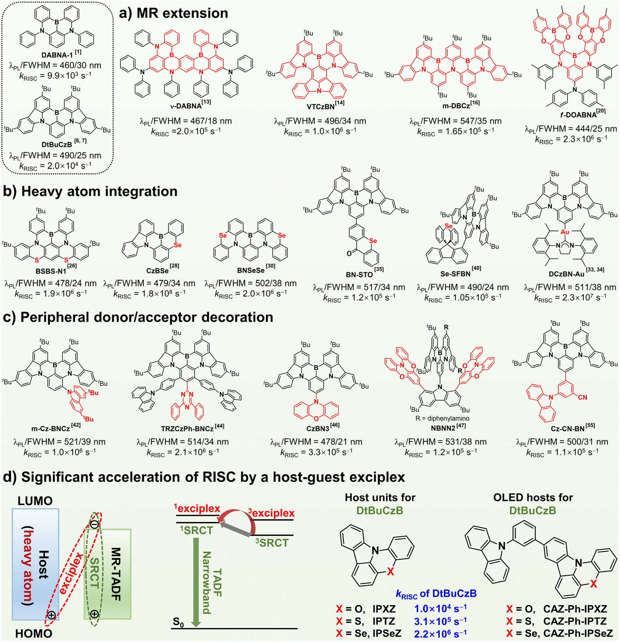 MR-TADF emitters, such as archetypal ν-DABNA and DtBuCzB (Fig. 1), usually show low RISC rates (kRISC) (103–104 s−1), which cause strong accumulation of triplet excitons in OLEDs and severe device efficiency roll-offs.1,6,7 Sensitized narrowband OLEDs are fabricated by adding sensitizers into the emissive layers to reduce the efficiency roll-offs,8,9 which however require ternary co-evaporation, complicating the device fabrication. Tremendous efforts have thus been devoted to directly accelerating the RISC of MR-TADF emitters by either reducing the ΔEST or strengthening the spin–orbital coupling (SOC) between the singlet and triplet states, as illustrated in Fig. 1.10,11 Extension of the MR framework reduces the ΔEST (Fig. 1a),10–25 while integration of heavy atoms (such as S, Se or heavy metal atoms) into the emitters strengthens the SOC (Fig. 1b).10,11,26–40 Peripheral decoration of MR-TADF emitters with donor/acceptor groups can reduce the ΔEST or introduce higher-lying long-range charge-transfer triplet states (3LRCT) into the emitters (Fig. 1c).10,11,41–56 Importantly, the introduced 3LRCT state largely accelerates the RISC of the MR-TADF core by serving as a critical intermediate triplet state, due to the rational SOC between the 3LRCT state and the short-range charge-transfer singlet state (1SRCT) of the MR-TADF core.44–56 So far, reported strategies to significantly enhance the kRISC values of MR-TADF emitters have been focused on molecular engineering of the emitters, which complicates molecular design and synthesis and easily causes red-shifted emission with widened emission spectra (Fig. 1a–c).10,11 Significantly accelerating the RISC of MR-TADF emitters with a facile, efficient strategy while maintaining the narrowband emission has remained a formidable challenge.