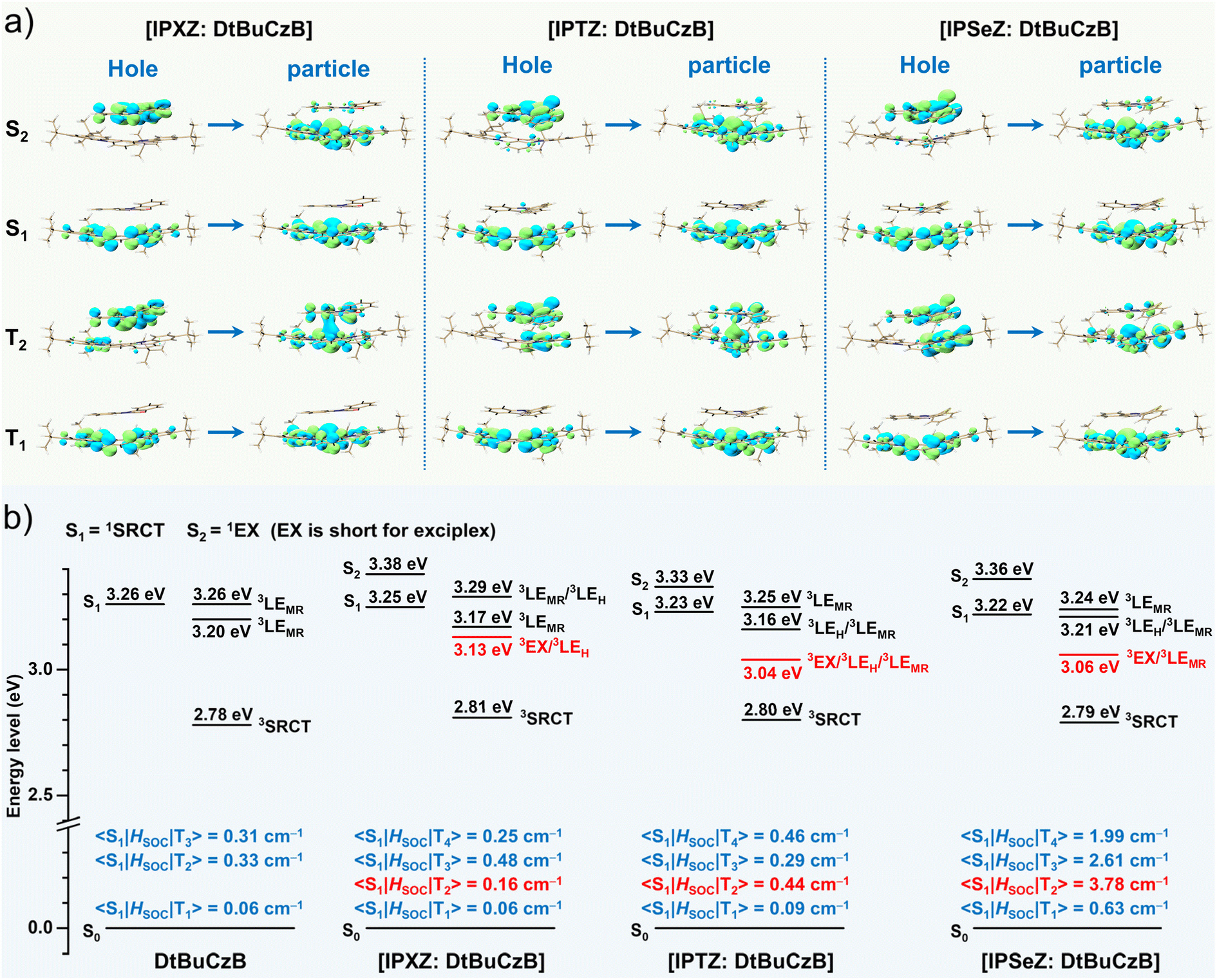 Time-dependent DFT calculations were further conducted on the optimized [host unit: DtBuCzB] at the M062X/6-31G* level. Table S2 summarizes the characteristics of the S1 and T1 states. Natural transition orbital (NTO) analysis was performed to analyze the character of excited states. Fig. 2a shows the NTO analysis for the S1, S2, T1 and T2 states and that for the T3 and T4 states is presented in Fig. S2. Fig. 2b depicts the character and energy levels of low-lying singlet and triplet states as well as the SOC matrix elements (SOCMEs) between the S1 and low-lying triplet states. For the [host unit: DtBuCzB] combinations, the S1 states are assigned as the 1SRCT states formed within DtBuCzB, whereas the S2 states are assigned as the 1exciplex states formed between the host units and DtBuCzB, which are located energetically above the S1 states by 0.10–0.14 eV (Fig. 2b). The T1 states are assigned as the 3SRCT states. The T2 states are a mixture of 3exciplex state and localized 3π–π* (3LE) state of the host unit or DtBuCzB. The T3 and T4 states are the 3LE states of the host unit or DtBuCzB or a mixture of them. As shown in Fig. 2b, the low-lying triplet states in a single DtBuCzB include one 3SRCT state (T1) and two 3LE states (T2 and T3), which correspond to the 3SRCT state (T1) and the 3LE states (T3 and T4) in [host unit: DtBuCzB], respectively. The T2 state (3exciplex) in [host unit: DtBuCzB] thus stands out as a unique intermediate triplet state between the 1SRCT and 3SRCT states to accelerate the RISC.