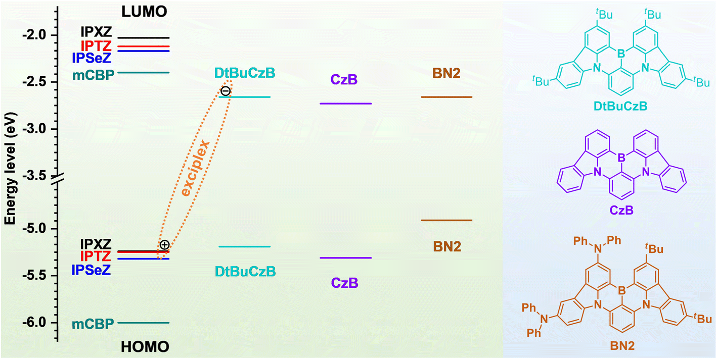Cyclic voltammetry measurements were performed for the host units in solution. Fig. S4a shows the cyclic voltammograms and Table S3 summarizes the onset oxidation potentials and calculated energy levels. From the onset oxidation potentials, the HOMO levels of IPXZ, IPTZ and IPSeZ were determined at −5.24, −5.25 and −5.32 eV, respectively. Ultraviolet photo-electron spectroscopy measurements were further conducted for the host units in film states (Fig. S5). The obtained ionization potentials agree with the HOMO levels derived from the onset oxidation potentials. Based on the HOMO levels and the optical bandgaps derived from the onsets of absorption spectra (Fig. S6a), the LUMO levels of IPXZ, IPTZ and IPSeZ were determined at −2.03, −2.12 and −2.17 eV, respectively. The HOMO and LUMO levels of selected MR-TADF guests (including DtBuCzB,6,7 CzB63 and BN2 64) were determined in a similar way (Fig. S4b, S6b and Table S3). Fig. 3 illustrates the energy level alignments between the host units and MR-TADF guests. The HOMO levels of the host units are only slightly lower (by 0.05–0.13 eV) than that of DtBuCzB, whereas the LUMO levels are much higher (by 0.49–0.63 eV) than that of DtBuCzB. Such an energy-level alignment allows facile electron transfer from the HOMO of the host unit to the LUMO of DtBuCzB, giving rise to an exciplex state. In contrast, for the common host mCBP,57 the HOMO and LUMO levels are considerably lower (by 0.81 eV) and higher (by 0.26 eV), respectively, than the HOMO and LUMO levels of DtBuCzB, which does not support efficient formation of the exciplex (Fig. 3). According to the emission peaks of low-temperature fluorescence and phosphorescence spectra (Fig. S7), the singlet/triplet energies of IPXZ, IPTZ and IPSeZ were determined at 3.28/2.85, 3.11/2.67 and 3.11/2.73 eV, respectively, which are considerably higher than those (2.59/2.46 eV) of DtBuCzB (Table S3).