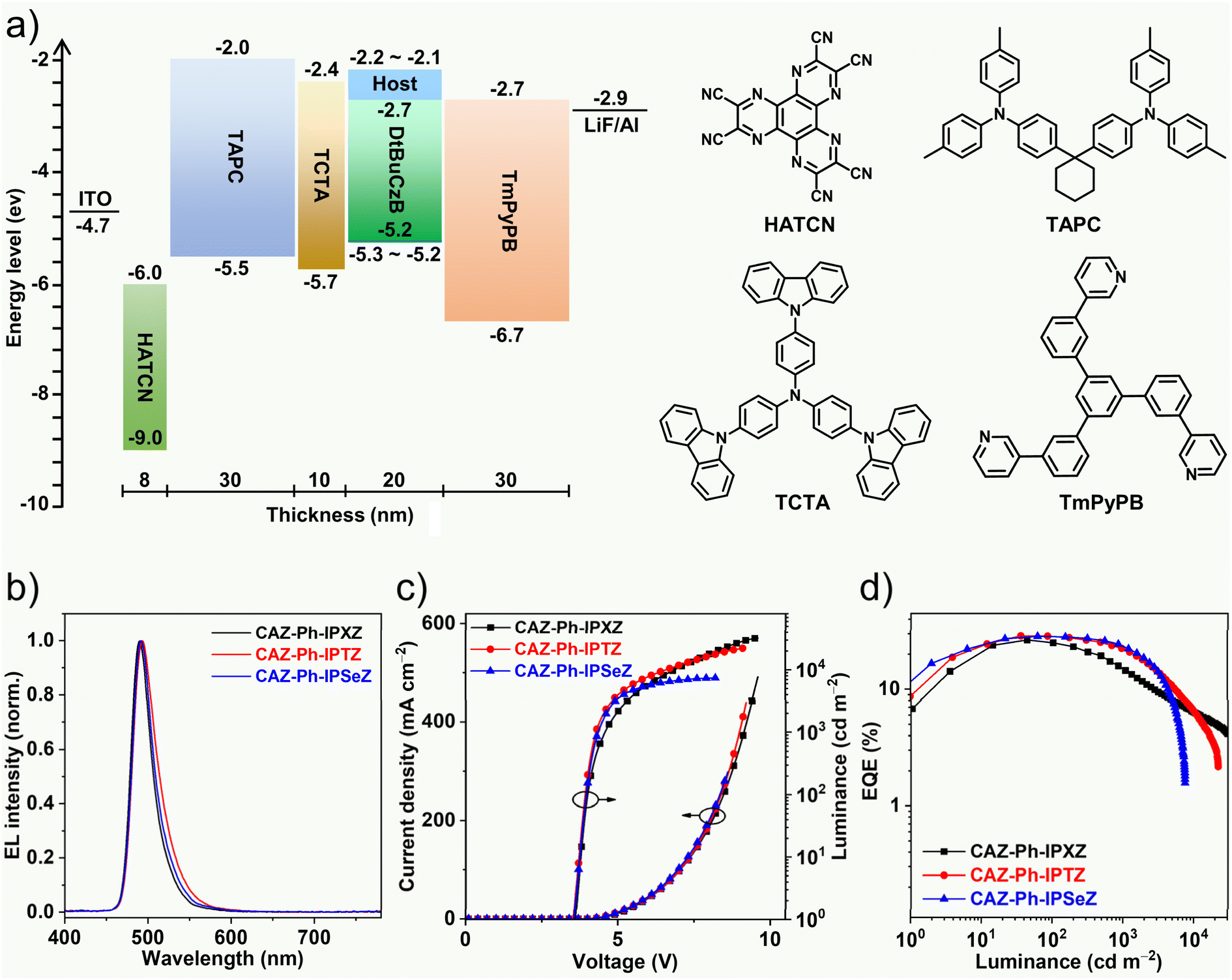 | a Doping concentration of DtBuCzB in the emissive layer is 2.0 wt%. b Voltage to reach 1 cd m−2. c Maximum current efficiency and the values at 100 and 1000 cd m−2. d Maximum EQE and the values at 100 and 1000 cd m−2. | ||||||