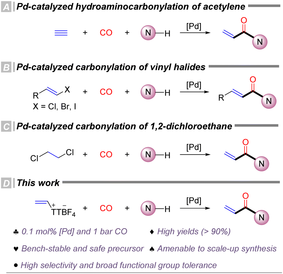 Based on our results and understanding, a plausible catalytic cycle for this carbonylative amidation is outlined in Scheme 3. The reaction is proposed to be initiated by oxidative addition of Pd(0) into the C–S bond of the vinyl thianthrenium salt, forming a vinyl-Pd(II) complex (B). The coordinating of CO with vinyl-Pd(II) complex (B) supposed to be important for its reactivity and stability which also explains no product was detected in the absence of CO in control experiment. Then, this intermediate undergoes migratory insertion of carbon monoxide to generate an acyl-Pd(II) species (C). Coordination and nucleophilic attack by the arylamine then affords intermediate D, which undergoes reductive elimination to deliver the final acrylamide product and regenerate the catalytically active Pd(0) species. This pathway is consistent with the requirement of CO for product formation and supports the critical role of TT+ as a leaving group in initiating the Pd-catalyzed cycle.