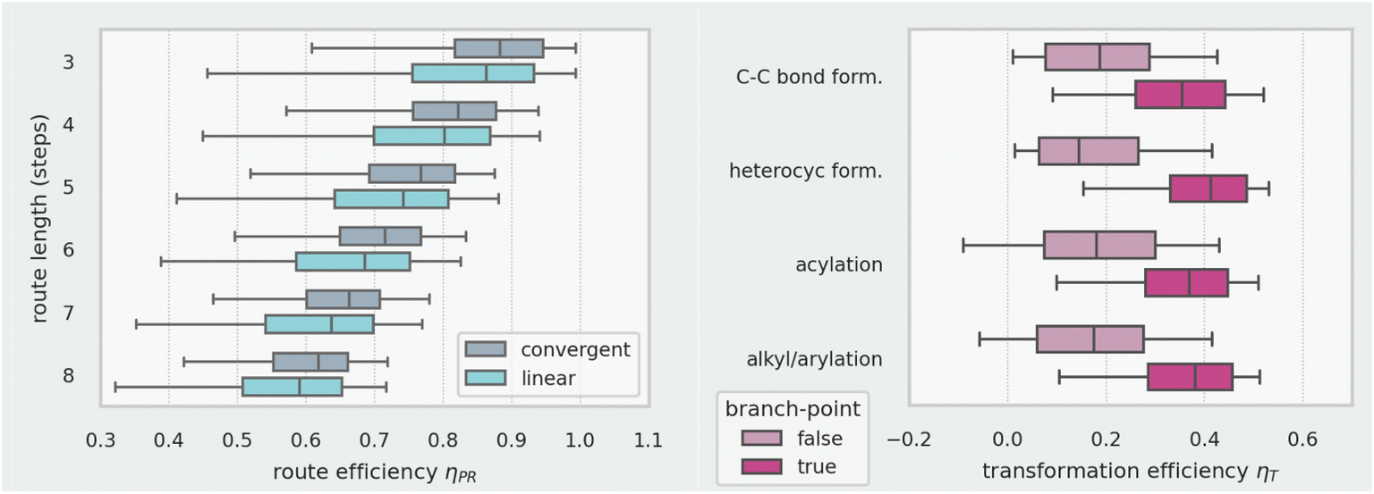 Regardless of this inconsistency, Fig. 11 (left) shows that for all route lengths, convergent routes show higher penalised route efficiency values μPR than linear routes and (Fig. 11, right) coupling reactions occurring at branch points are significantly more efficient (ηT) than those occurring at non-branch points. This is logical since the branch point in a convergent route, where two significant skeletal fragments come together, is likely to feature a large increase in similarity and complexity. The same efficiency analysis we have described for the LLS could also be carried out for any parallel synthetic branches, between its starting material and the branch point, to give a second efficiency measure for the route. As a final, expected observation, Fig. 11 shows a steady decrease in route efficiency with route length.