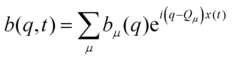 . In the following we refer to this quantity as the ISF. The brackets 〈⋯〉 indicate an ensemble average. The conventional ISF to wave number q + Qμ then corresponds to F(q + Qμ,t) := Fμμ(q,t) and probes diagonal correlations in reciprocal space. The off-diagonal elements Fμν(q,t), μ ≠ ν, encode Umklapp-processes where wave vectors differ by a reciprocal lattice vector Qν − Qμ. These Umklapp-processes enter by scattering from the periodic modulation, while they are absent in the homogeneous case. Thus, Fμν(q,t) corresponds to a matrix-valued correlation function: for a set of complex numbers bμ(q) ∈