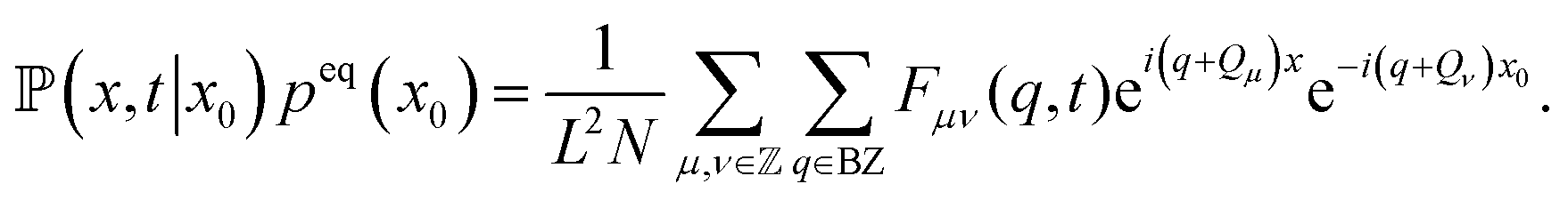 Further, we note that the wave number q is identical in both exponentials and that the diagonal elements, Fμμ(q,t), correspond to the conventional ISF evaluated at wave vector q + Qμ. In translationally invariant systems only the diagonal elements are non-vanishing, since shifting the trajectory of a particle by an arbitrary displacement leads to an equally likely trajectory. For our case, the discrete symmetry is reflected in the sense that a common shift x(t) ↦ x(t) + R for all times by a lattice vector R ∈ Λ leaves the ISF invariant. The brackets 〈⋯〉 indicate an ensemble average.