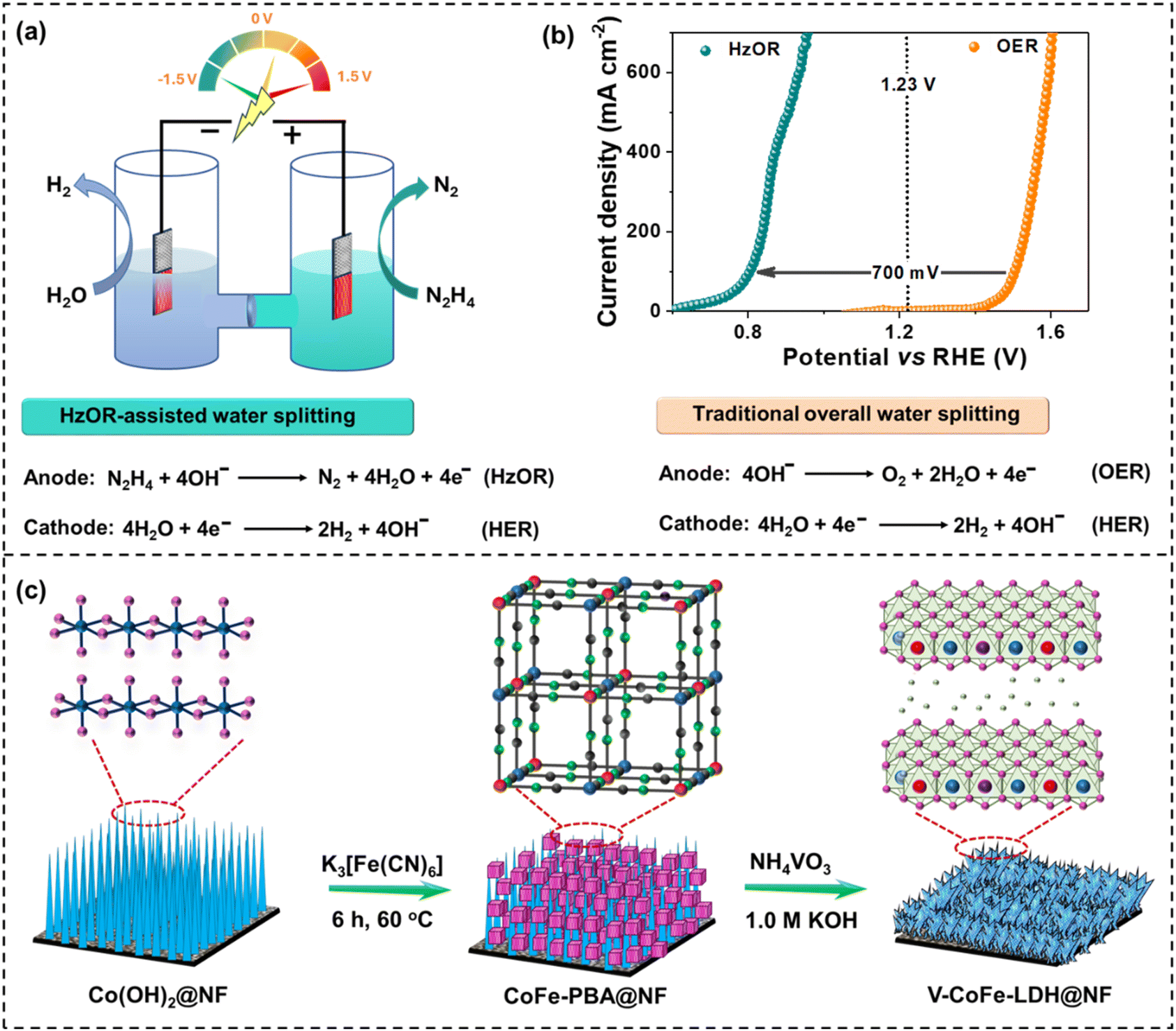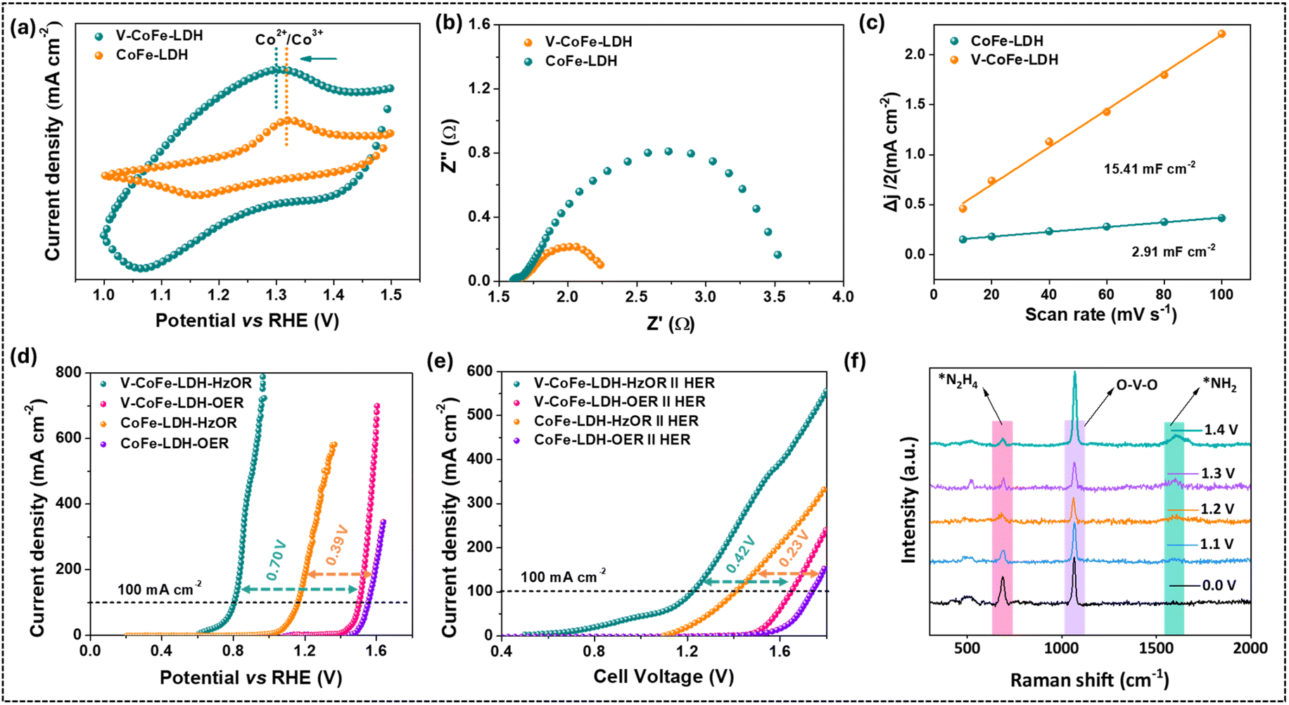 As a result, V-CoFe-LDH nanosheets exhibited significantly improved HzOR activity compared to CoFe-LDH. Additionally, the incorporation of V4+/V5+-ions in CoFe-LDH was found to boost the efficacy of water splitting when the OER was substituted with the HzOR. The PBA-derived V-CoFe-LDH nanosheets achieved a current density of 100 mA cm−2 for the OER at the voltage demand of 1.50 V vs. RHE, while only 0.80 V vs. RHE was required for the HzOR. Additionally, V-CoFe-LDH manifested a cell potential of 1.22 V for 100 mA cm−2 current density for the HzOR, significantly lower than that of water splitting involving the anodic OER (1.64 V) in a two-electrode system. Furthermore, the efficiency of this newly developed catalyst was demonstrated by its remarkable HzOR activity compared to V-CoFe-LDH-HT, prepared by the hydrothermal method.