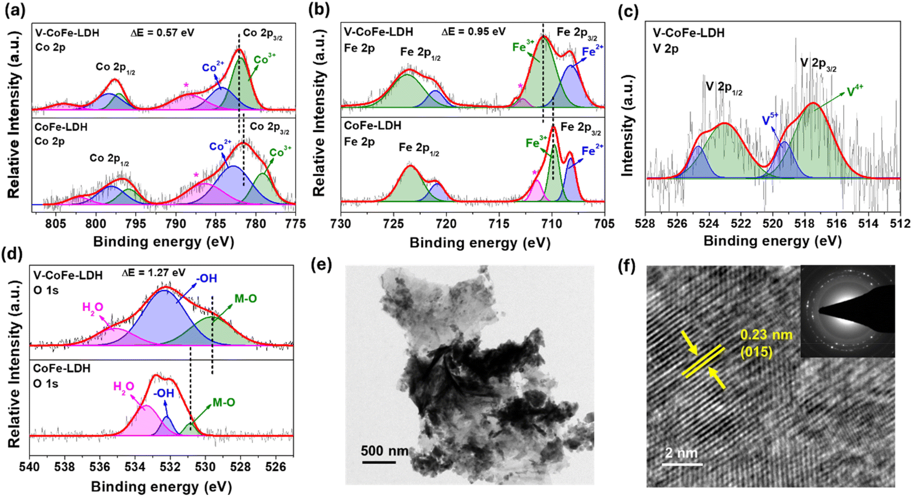 V-CoFe-LDH was found to have a Co 2p3/2-Co 2p1/2 spin–orbit coupling energy difference of 15.66 eV, indicating the presence of mixed-valent Co2+ and Co3+ species (Fig. 2a). The high Lewis acidic nature of V4+/V5+ facilitated electron transfer from Co2+ to V4+/V5+, enhancing the electrophilicity of Co sites.61