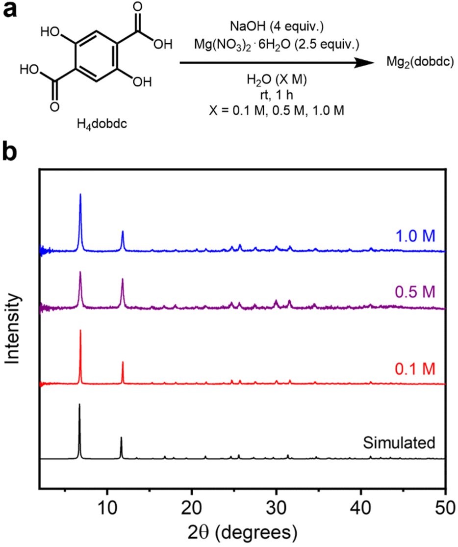 | | Fig. 2 (a) Reaction conditions for the high-concentration aqueous synthesis of Mg2(dobdc). (b) Baseline-corrected PXRD patterns (λ = 1.5406 Å) of Mg2(dobdc) synthesized at different reaction concentrations. The simulated pattern based on the previously reported single-crystal X-ray diffraction (SCXRD) structure of the isostructural Zn2(dobdc) is included (ref. 38). | |
