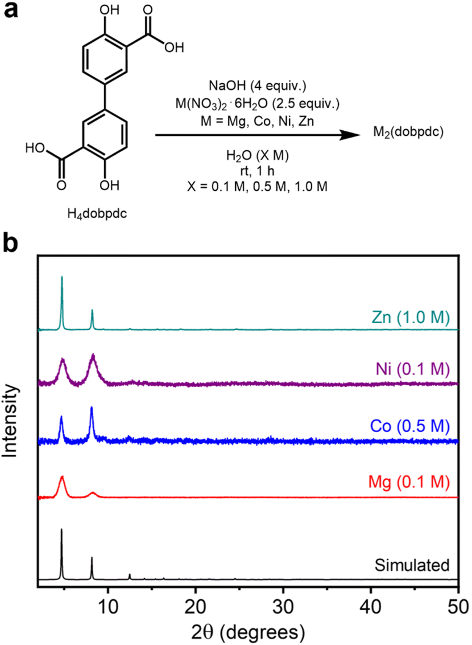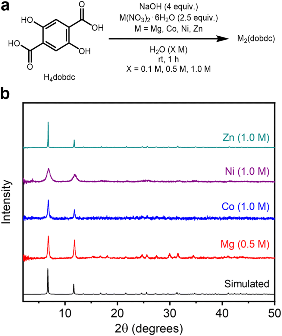 | | Fig. 3 (a) Reaction conditions for the high-concentration aqueous synthesis of M2(dobdc) (M = Mg, Co, Ni, Zn). (b) Baseline-corrected PXRD patterns (λ = 1.5406 Å) of M2(dobdc). The patterns corresponding to samples exhibiting the highest BET surface areas are shown. The simulated pattern based on the previously reported SCXRD structure of Zn2(dobdc) is included (ref. 38). | |