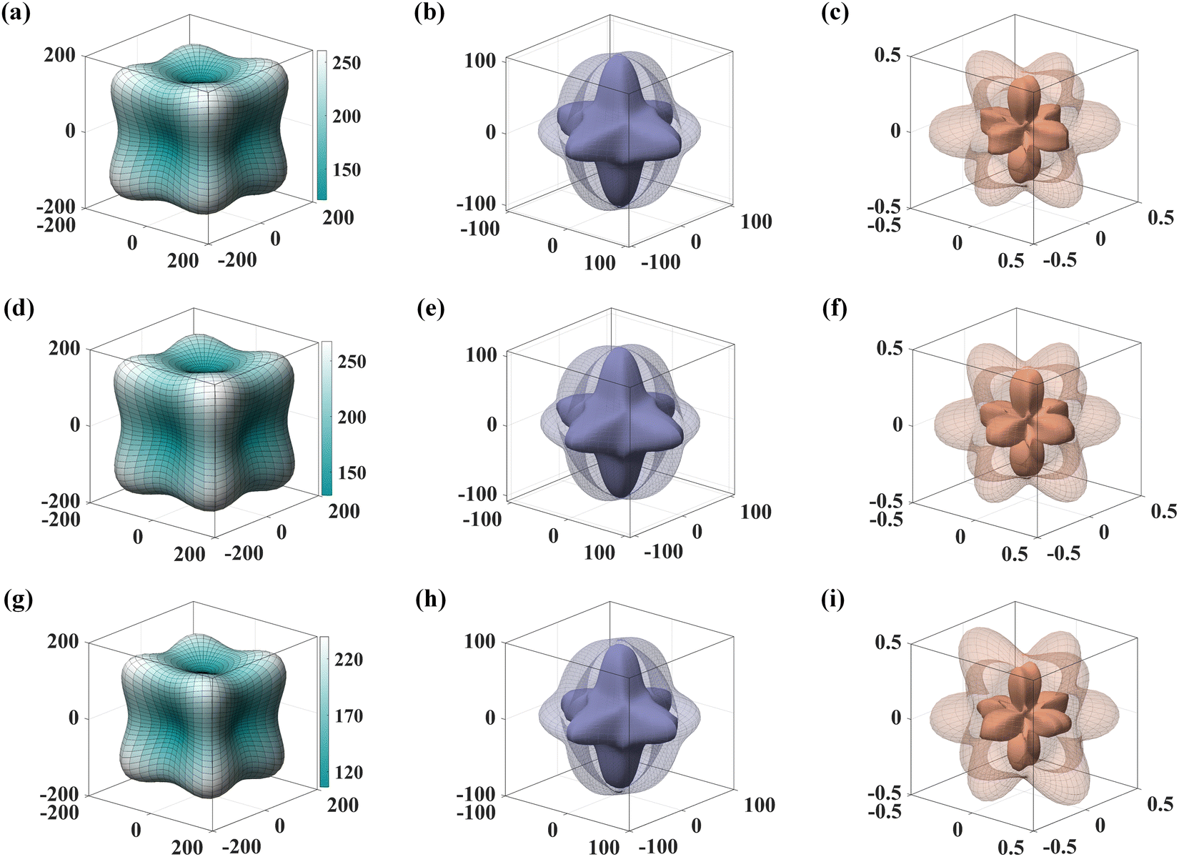 Fig. 1 Direction-dependent 3D view of Young's moduli, shear moduli and Poisson ratio for the model (a)–(c), the model (d)–(f), and the model (g)–(i). | ||