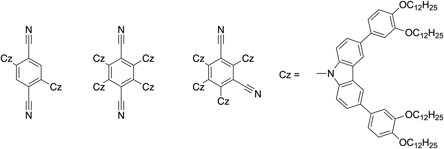 Fig. 1 Examples of LC TADF materials prepared with phthalonitriles as the acceptor and a functionalised carbazole as the donor. |