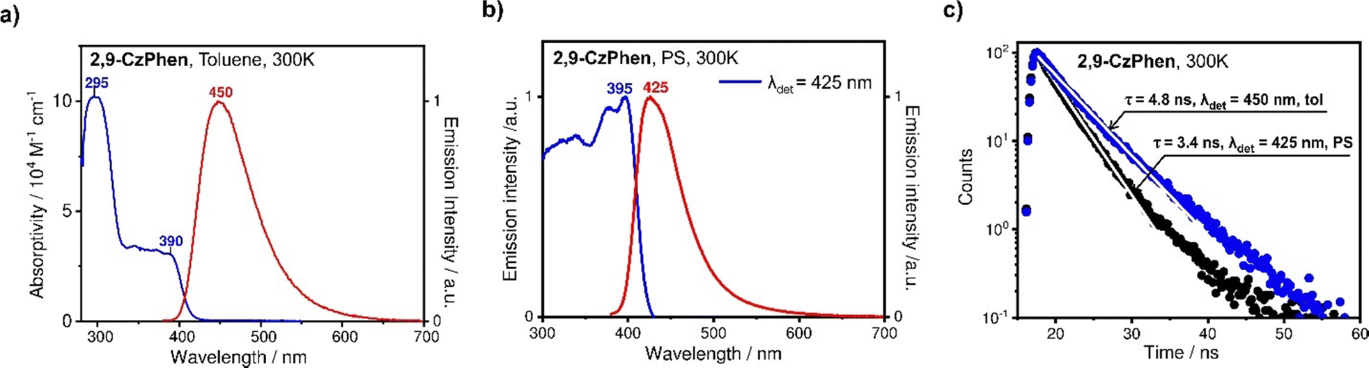 All three compounds – 2,9-CzPhen, 3,8-CzPhen and 4,7-CzPhen – show fluorescence in toluene solution centred at ca. 450 nm arising from a singlet state localised on the alkoxyaryl carbazole moieties (1[πCzπ*Cz]). In the doped PS film this emission shift to ca. 420 nm in case of 3,8-CzPhen and 4,7-CzPhen and is also accompanied by additional fluorescence bands centred at 570 nm and 515 nm, respectively, assigned to the charge-transfer singlet state (1[πCzπ*phen]). Such unusual dual fluorescent behaviour is rationalised by the electronic decoupling of the 1[πCzπ*Cz] and 1[πCzπ*phen] states, brought primarily by spatially isolated π*Cz and π*phen orbitals, where the wavefunction of the excited electron is well separated between the two states. This drastically limits the rate and efficiency of internal conversion between the two states and thus allows rare anti-Kasha emission from a higher-energy excited singlet state. Only for 4,7-CzPhen in a PS matrix could a very small share of the emission intensity (ca. 5% of emission from the 1[πCzπ*phen] state) be identified as arising with the participation of a triplet state, being assigned to TADF. This is associated with (i) the presence of two CT triplet states, T1 and T2, in very close energetic proximity to the S1 state (1[πCzπ*phen]) so that ISC and RISC processes can be relatively fast, and (ii) relatively high energy of the lowest singlet and triplet CT states limiting the efficiency of their non-radiative decay rate to the ground state, manifested by much longer decay time of 1[πCzπ*phen] prompt fluorescence (21 ns) compared to that of other two materials. Both photophysical parameters are understood to arise from the relatively twisted geometry of the alkoxyaryl carbazole substituents with respect to the phenanthroline, diminishing ΔE(S1–T1) and giving higher energies of S1 and T1 as well as a hindered geometry, so restricting reorganisation in the CT excited state. It is concluded, therefore, that molecular design strategies involving substitutions that would position the alkoxyaryl carbazoles at a larger angle with respect to the phenanthroline core and hinder geometry changes in the CT character excited state would be beneficial for the improvement of the TADF properties of these liquid-crystalline, white-luminescent materials. Additionally, complexation of the phenanthroline with transition metals could help enhance the spin–orbit coupling effect and thus afford more efficient ISC and RISC processes involved in TADF.