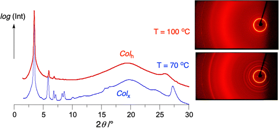 Finally, compound 18 exhibits similar stability of the Colh phase as the cyclic product 2d. Unlike the cyclic product, 18 also displays the Colx phase below 100 °C.